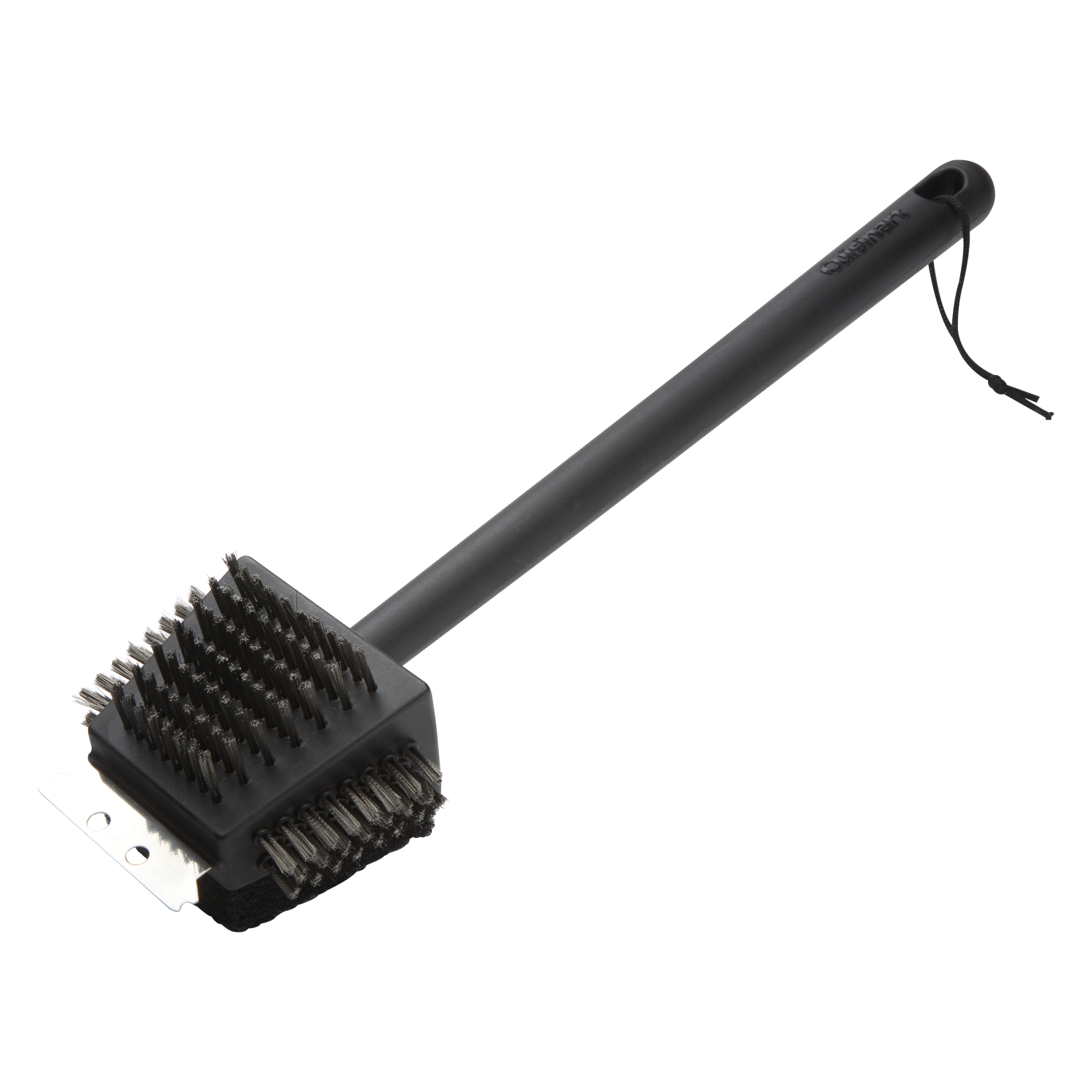 The Cuisinart 4-in-1 Grill Cleaning Brush is the all-in-one tool to clean any type of mess on your grill surface. This 4-in-1 brush combines hot. cold, and detail cleaning using 4 different cleaning applications. First, the main side of the brush features stainless-steel wire bristles for cleaning your grill while it is warm, and second, the scour pad on the reverse side cleans your grill while it is cool. Third, on each of the shorter sides there are densely-packed stainless-steel wire bristles for detail cleaning between grill grates and other tight areas of your grill. Lastly, the stainless-steel scraper on the end of the brush head helps remove any burnt-on pieces that may get left behind. The brush handle measure 13" in length allowing you to easily reach all areas of your grill.
