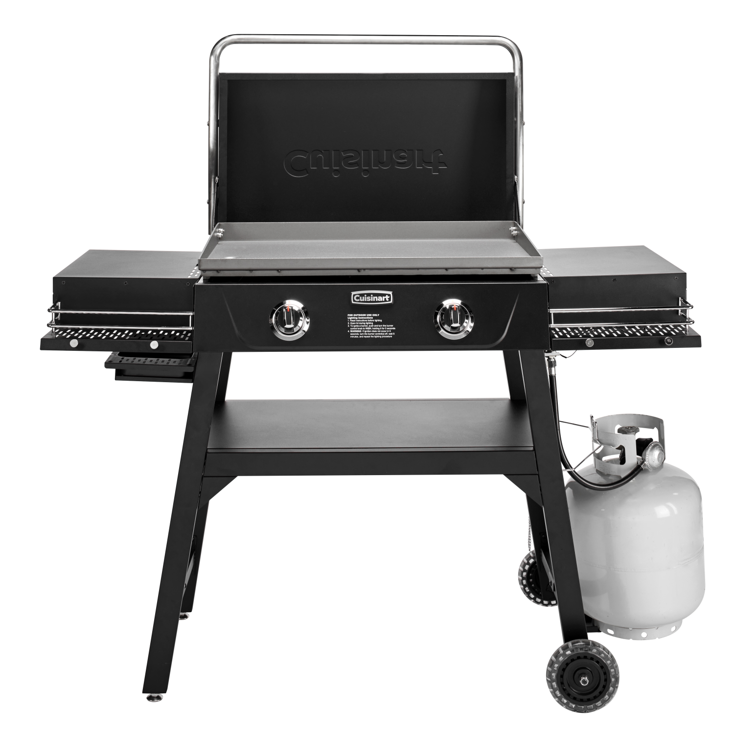 The Cuisinart 28" Outdoor Griddle brings greater cooking versatility to your backyard. The 504 sq. in. carbon-steel flat top cooking surface fits up to 24 burgers at a time, along with every other meal in between. The combined 30,000 BTUs between two stainless steel burners gives you cooking temps up to 600 F for high-heat searing. The side shelves feature integrated condiment caddies to store all of your sauces and spices while cooking. The griddle includes a hood to protect the griddle surface between uses.