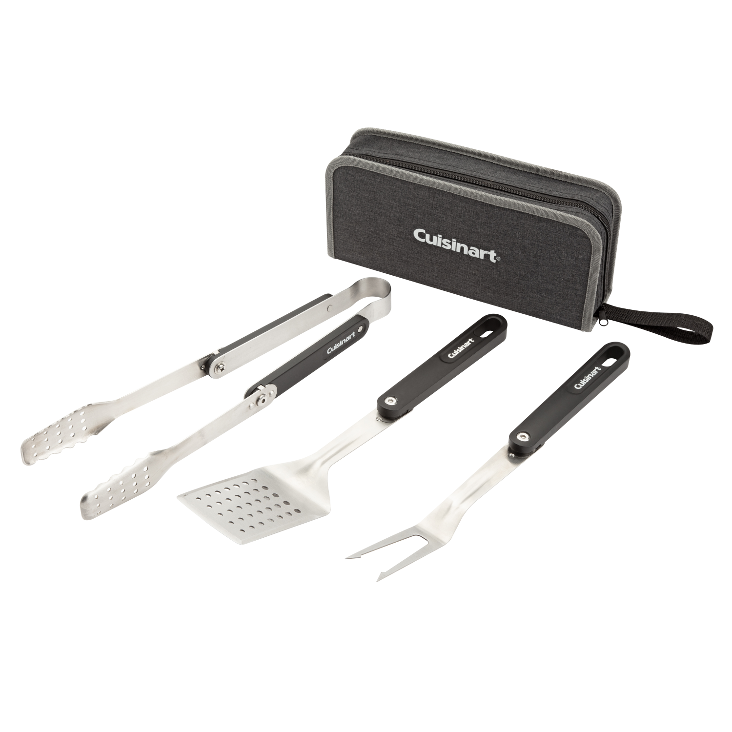 The Cuisinart 4 Piece Folding Grill Tool Set is the perfect set for camping, tailgating, or at home! This compact set includes a spatula, tongs, fork and carrying case. The tools feature an easy to use push pin design that makes folding and opening the tools effortless. The push pin design also ensures that the tools will stay firmly locked in place when in use. Other grill tools can be long and clunky and take up too much drawer space. The Cuisinart 4 Piece Folding Grill Tool Set includes a stylish carrying case that is compact and easy to store.