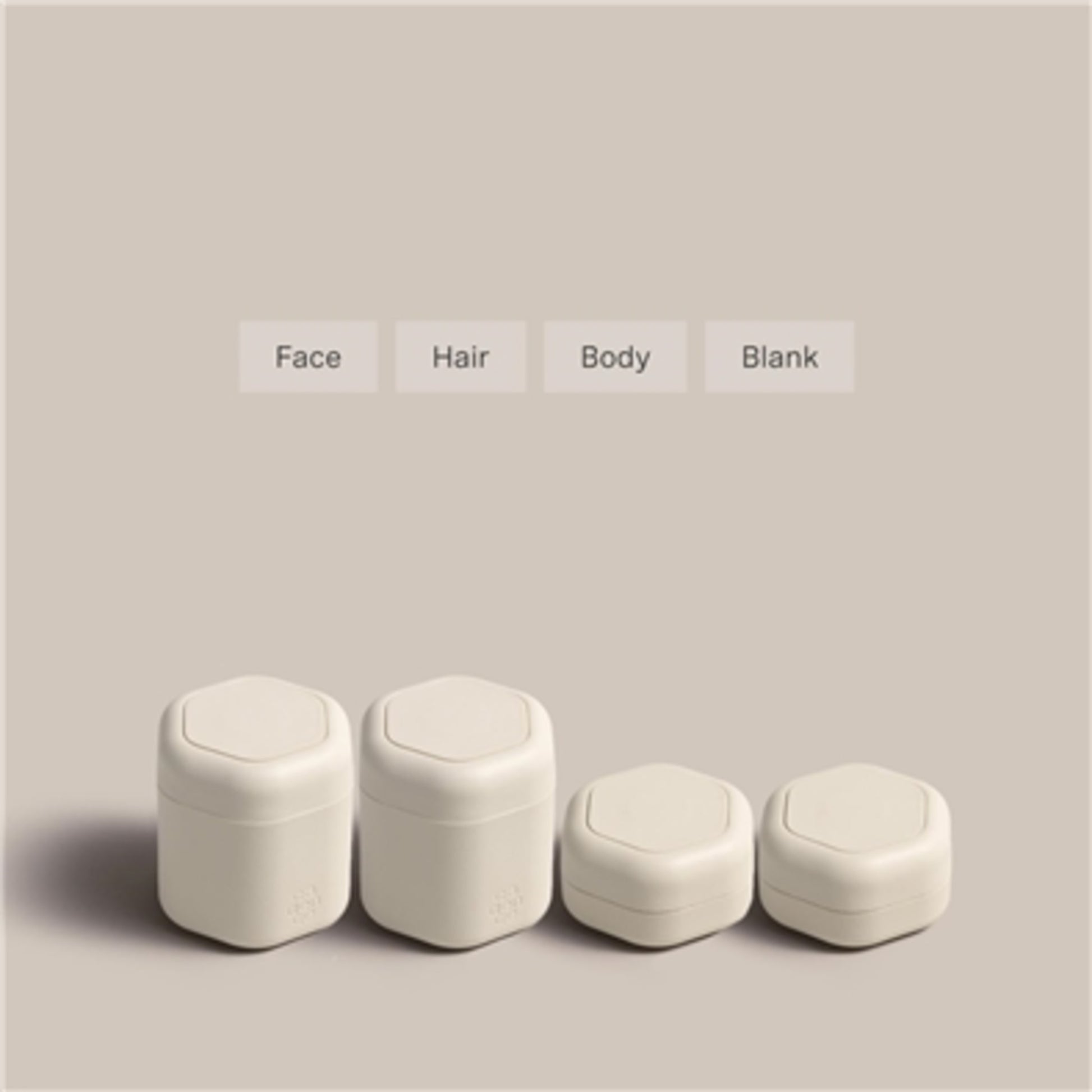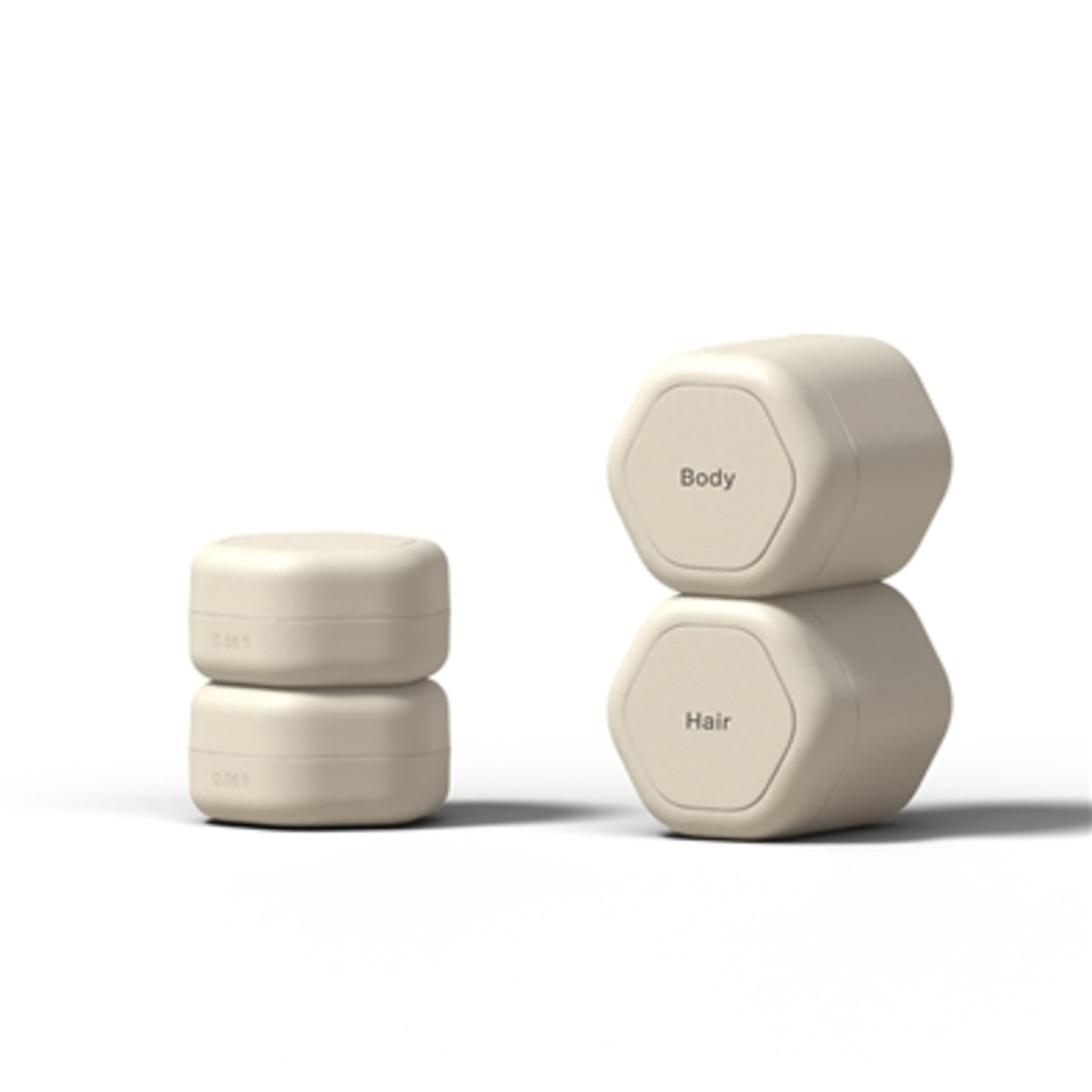 The Essentials includes two Medium Capsules (1.32 fl oz) labeled “Body” and “Hair,” and two Small Capsules (0.56 fl oz) labeled “Face” and blank. This set is perfect for your go-to travel products, so you can bring your favorites with you on the go. Each capsule is made using post-consumer materials and is leakproof, magnetic, space-saving, TSA-approved, and comes with a magnetic, interchangeable label.