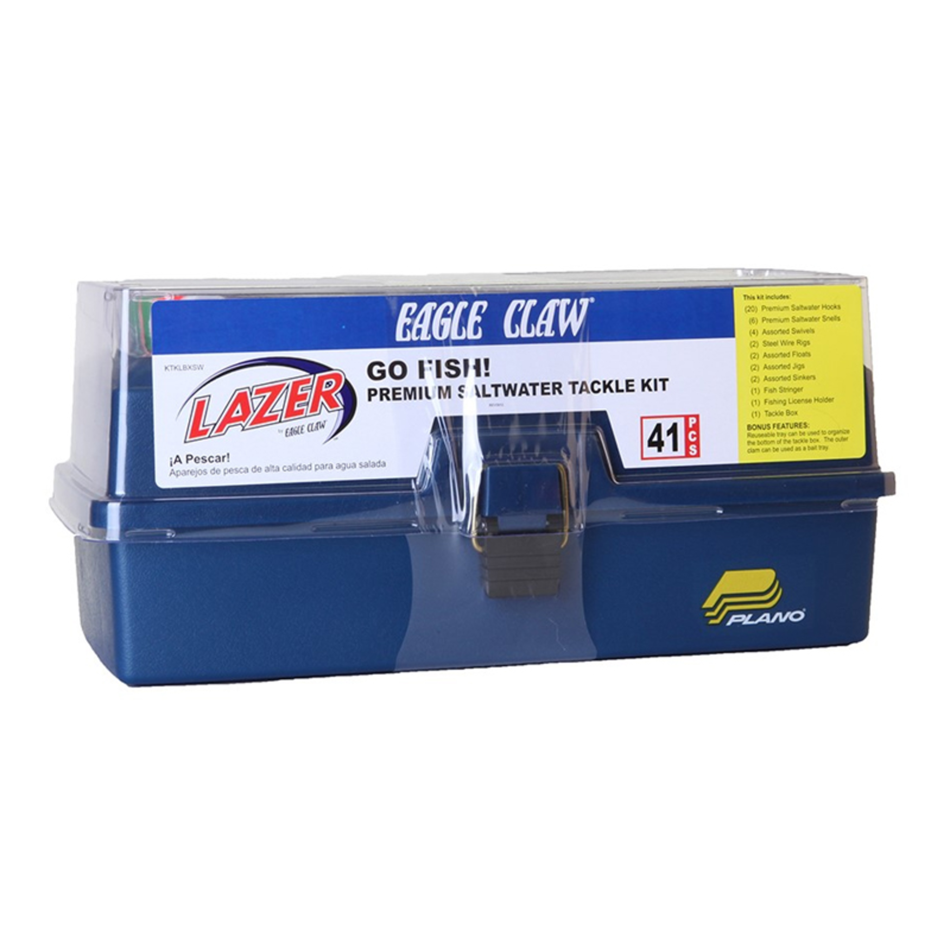The Eagle Claw Tackle Kit offers a wide variety of fishing implements, making it an excellent choice for the avid fishing enthusiast. This Go Fish! fishing tackle kit includes a stringer, fishing line and line clippers, as well as bells, swivels, hooks, sinkers and bobbers. All these accessories come in a Plano fishing tackle box for security and protection. This kit contains everything you need for fishing in saltwater areas, all in a convenient tackle box. Contains premium saltwater hooks and snells. Contains assorted swivels, steel wire rigs and floats. Comes with assorted jigs and sinkers. Equipped with a fish stringer and fishing license holder.