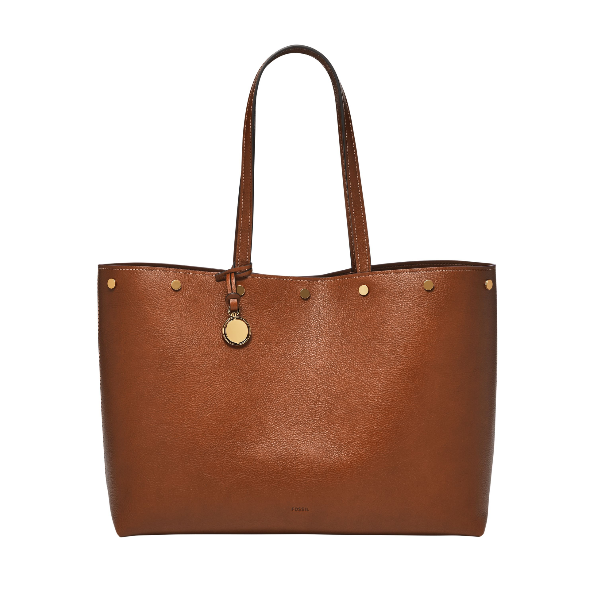 Our Jessie tote handles it all with the utmost style. Made from classic brown leather, it features textured rivets—a detail inspired by our watch crowns—that lend subtle shine and extra structure. A spacious, durable interior holds practically everything, and an attached wristlet keeps your essentials close.