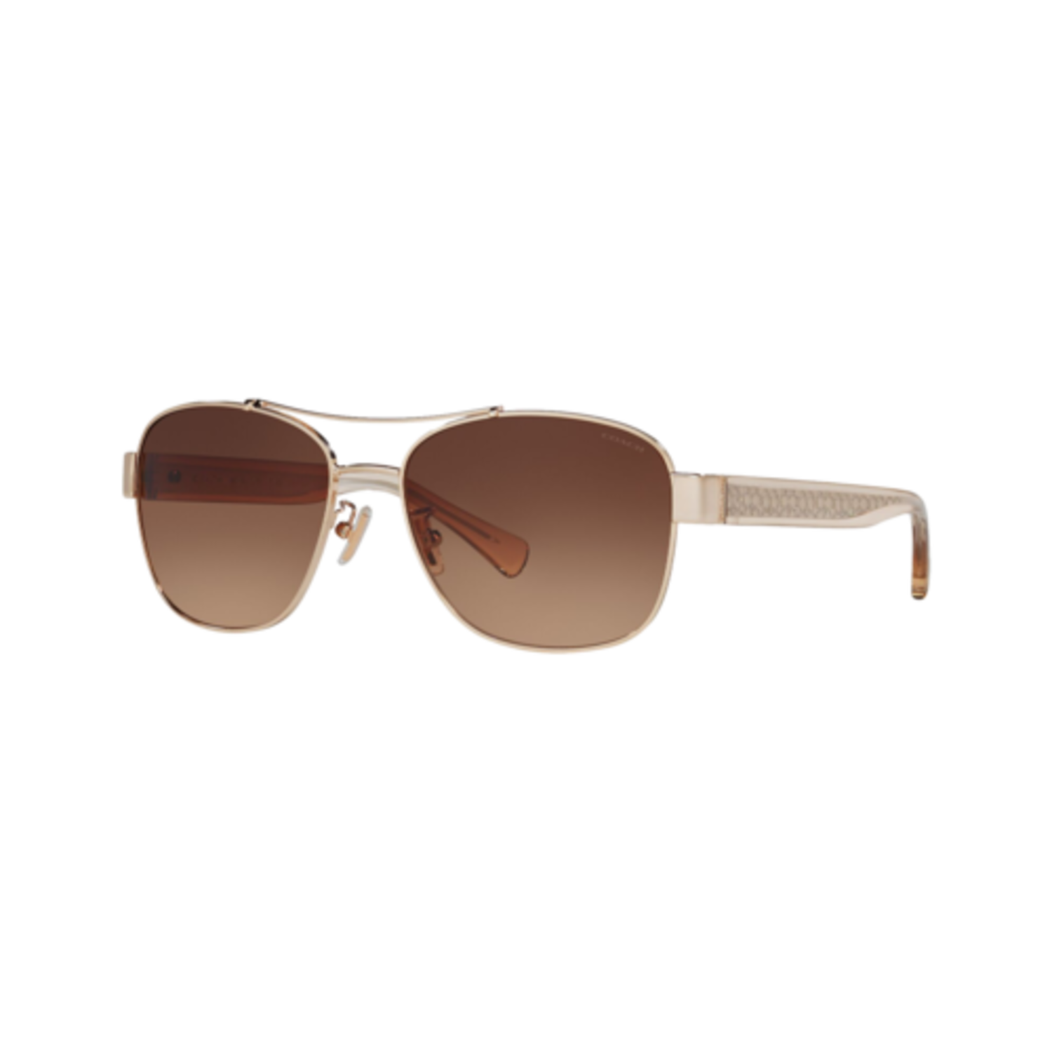 Coach is a modern luxury brand with a rich American heritage. These women's designer sunglasses in gold with brown gradient lenses lend feminine charm to the pilot shape. Crafted from metal, these frames are flexible yet strong. Rounded hinges flow into patterned temples with see-through core wires. Eye size: 56; Frame: Gold; Lens: Brown Gradient; Lens Material: Standard Plastic