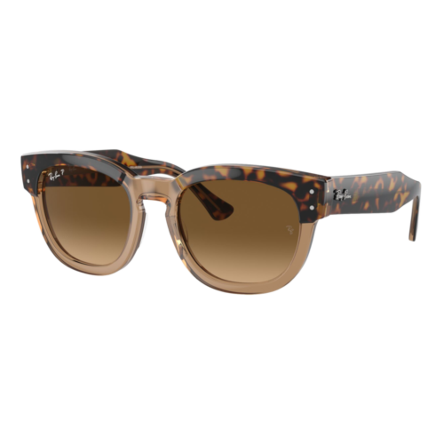 Preserving the sophistication of the original iconic Hawkeye style of 1968, the bold RB0298S Mega Hawkeye revives the original with even more personality. The pair feature a thick profile and temples, characterized by instantly recognizable metal dot rivets. Eye Size: 53; Frame: Polished Havana on Transparent Brown; Lens: Polarized Brown Gradient; Lens Material: Polarized Glass