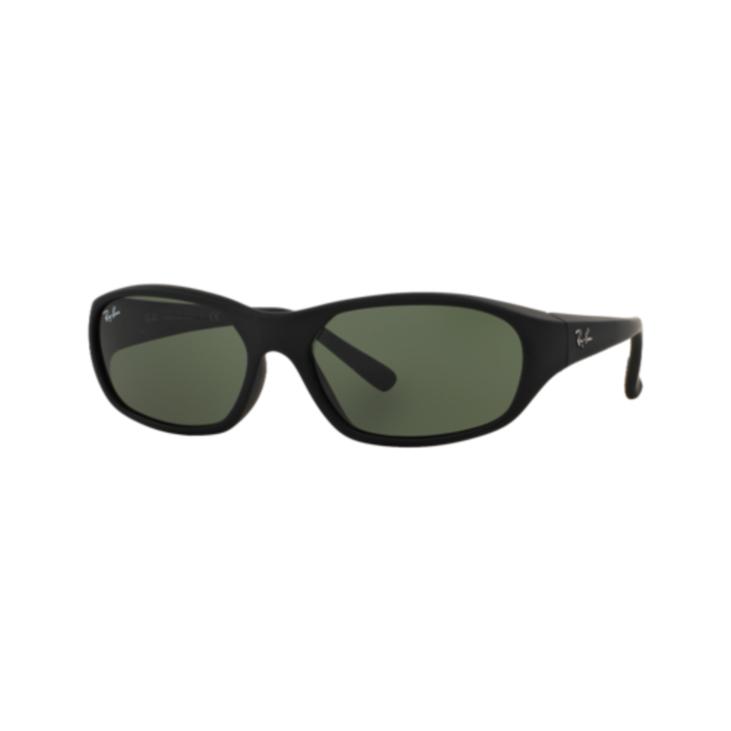 With a sporty, contoured silhouette, these sunglasses are stylishly cool. Rounded rectangular lenses provide excellent color contrast and clarity while blocking the sun's harshest rays. The classic metal Ray-Ban signature is prominent on curved temples. Eye size: 59; Frame: Matte Black; Lens: Green Classic G-15; Lens Material: Standard Plastic