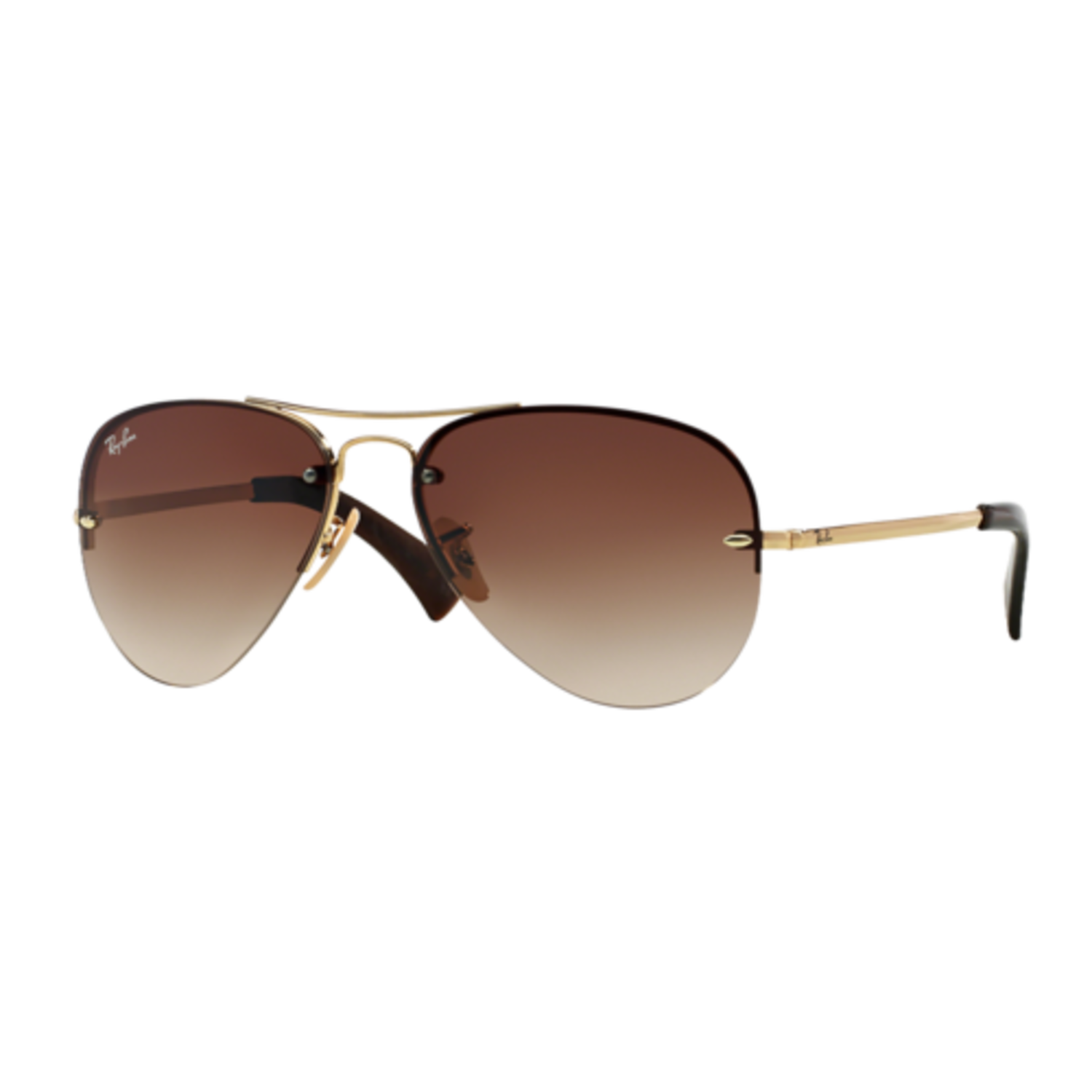 Ray-Ban RB3449 iconic Aviator sunglasses are a semi-rimless update of the classic Large Metal Aviator, originated in 1937. Eye size: 59; Frame: Gold; Lens: Brown Gradient; Lens Material: Standard Plastic