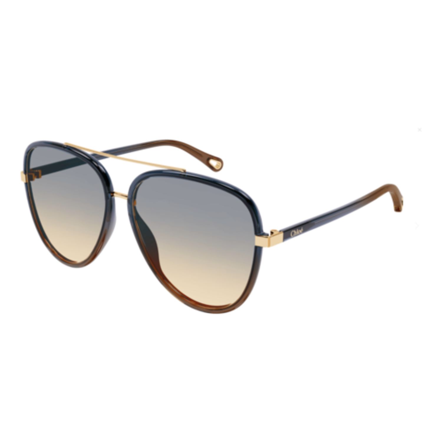 Two-tone, full-rim metal frames define these Chloe sunglasses, styled in a pilot silhouette with a bold top bar. Engraved logos and cut-out tips elevate the temples, while gradient lenses finish this sleek design. Eye Size: 58; Frame: Grey; Lens: Grey Gradient; Lens Material: Standard Plastic