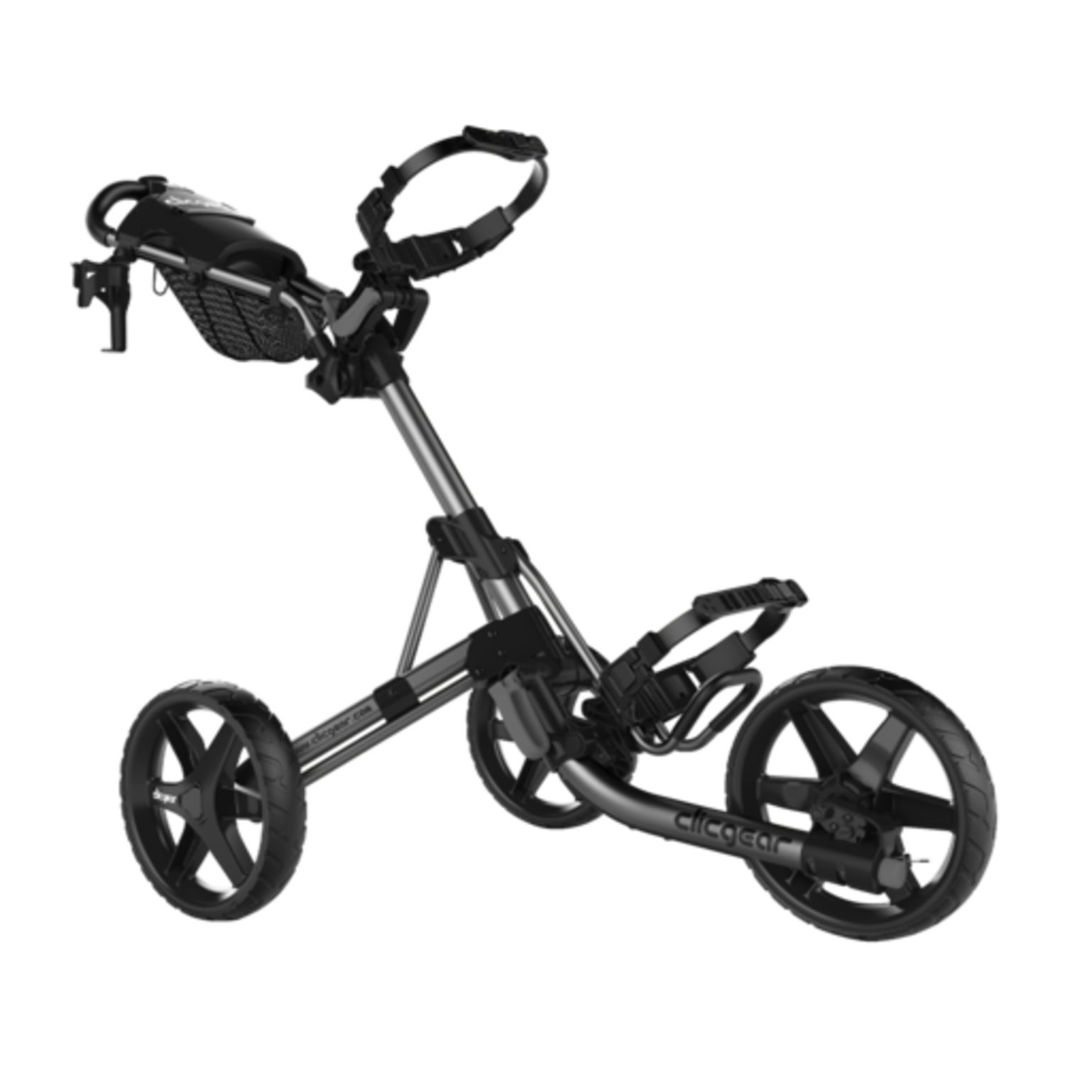 Clicgear's flagship 3-wheel cart. Refined and upgraded through the years. The Model 4 features new silicone bag strap system, new adjustable upper saddle, new lower saddle, front-wheel engaged hand brake, independent handle bar adjustments, large console (scorecard, ball, pencil & tee holders), large storage net, accessory mounts x4 (standard cup holder included), umbrella mount & bracket, and 21lb heavy-duty frame. It quickly folds down to a compact 13" x 15" x 24" and it accommodates most stand bags.
