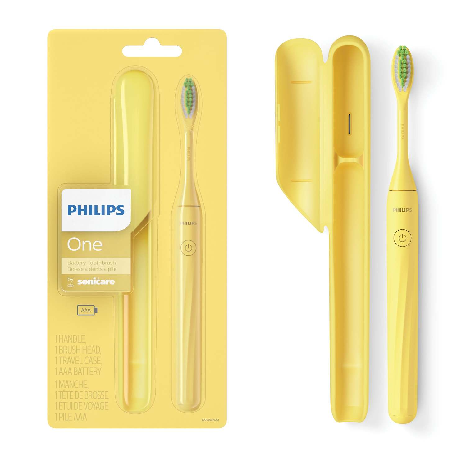 The One cleans teeth for a brighter whiter smile. Uses micro-vibrations and and contoured bristles to gently clean and polish. Buzzes every 30 seconds to encourage moving to another section of the mouth. Take it with you using the sleek lightweight and portable case. Use for 90 days with a single AAA battery. Subscribe to replacement brush heads that are delivered to your home. Includes: Philips One handle. Philips One brush head. Travel case. 1 AAA battery.