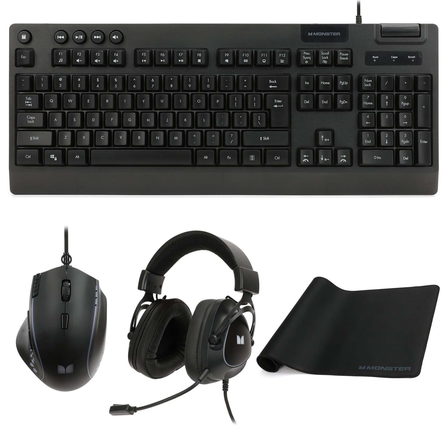 Keyboard with number keypad. Mouse features 3200 ultra-high DPI. Gaming headset has 40mm hi-def drives volume control and comfy padding. Mouse pad has anti-slip base with super-fine fiber. USB receiver connector type. Mechanical keyboard type. Includes: Mouse. Keyboard. Headset. Mouse pad.