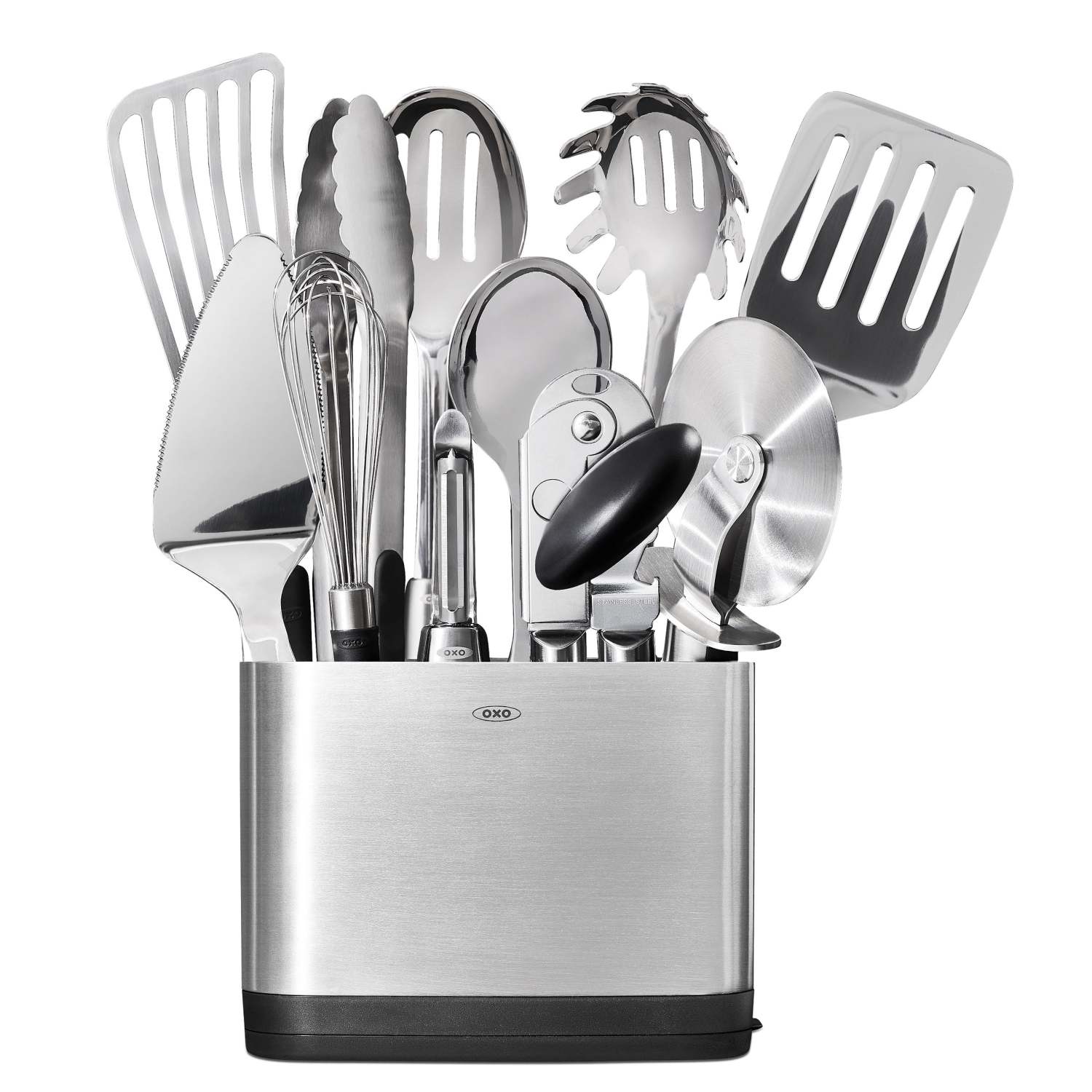 Gain all the basic tools necessary for preparing and serving meals. Each utensil is made of durable stainless steel. Constructed with non-slip grips and sleek designs. Dishwasher safe except for can opener. Includes: Spoon. Slotted spoon. Turner. Lasagna tuner. Spaghetti server. 12" Locking tongs. Fish turner. Flex turner. Whisk. Pie server. Pizza wheel. Swivel peeler. Can opener.
