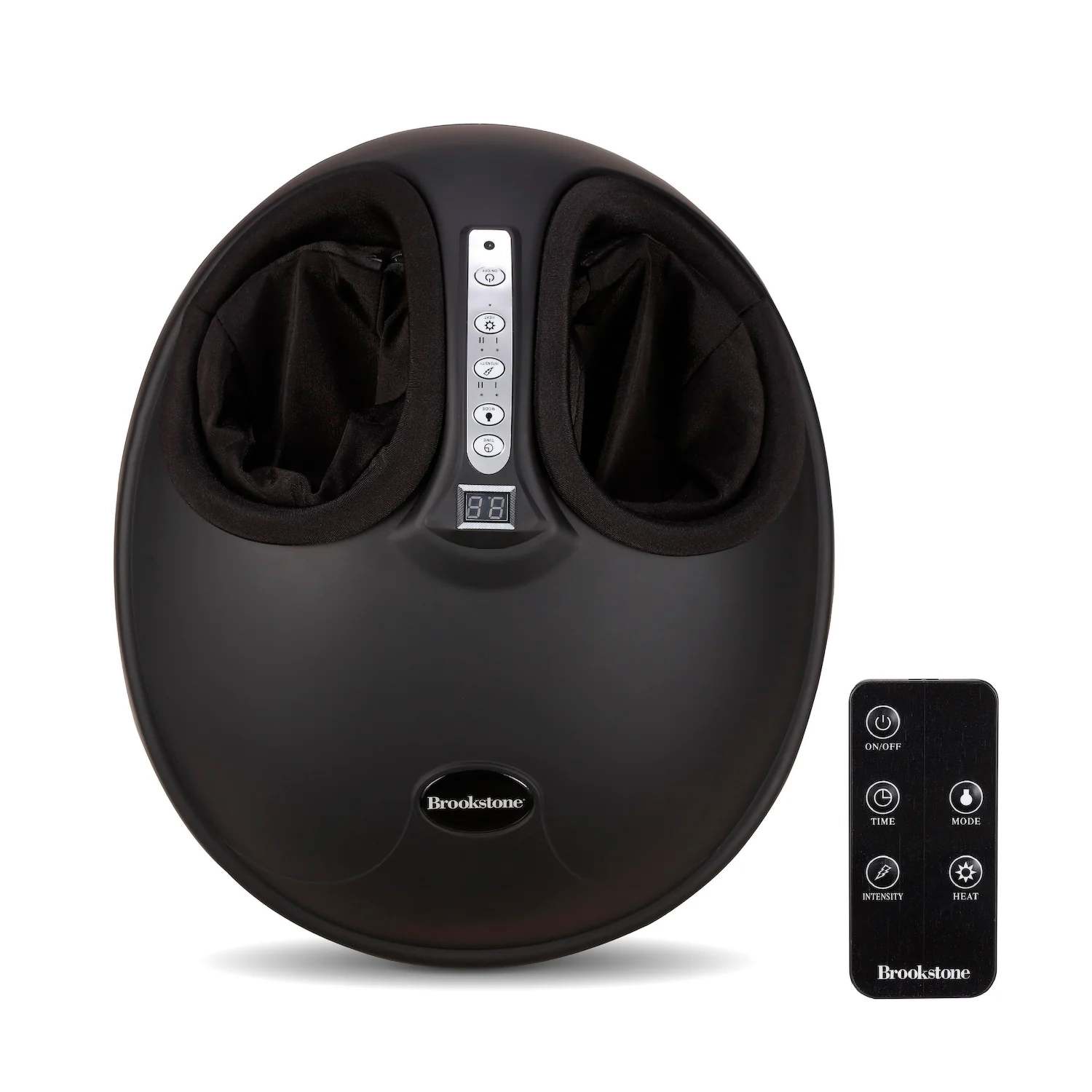 Relieve pain on legs ankle and feet with this air pressure foot massager. Air compression applies pressure to all parts of foot during rolling massage. Built-in heat therapy promotes blood circulation. Three pressure levels with kneading or heat options. Timer function automatically turns off massager when done. LCD display and massage mode buttons on massager. Wireless remote control included. Portable and stylish dome shape.