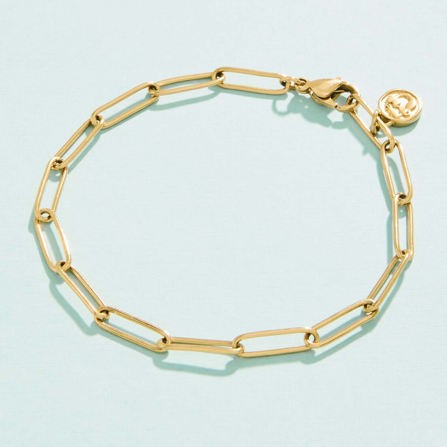 Make a splash with this Coligny Beach Bracelet. Designed with the ever popular paperclip chain. Shines through everyday wear exercise showers and summer at the beach. Made with tarnish-free 14k gold plating over stainless steel. Water resistant. Lobster clasp closure.
