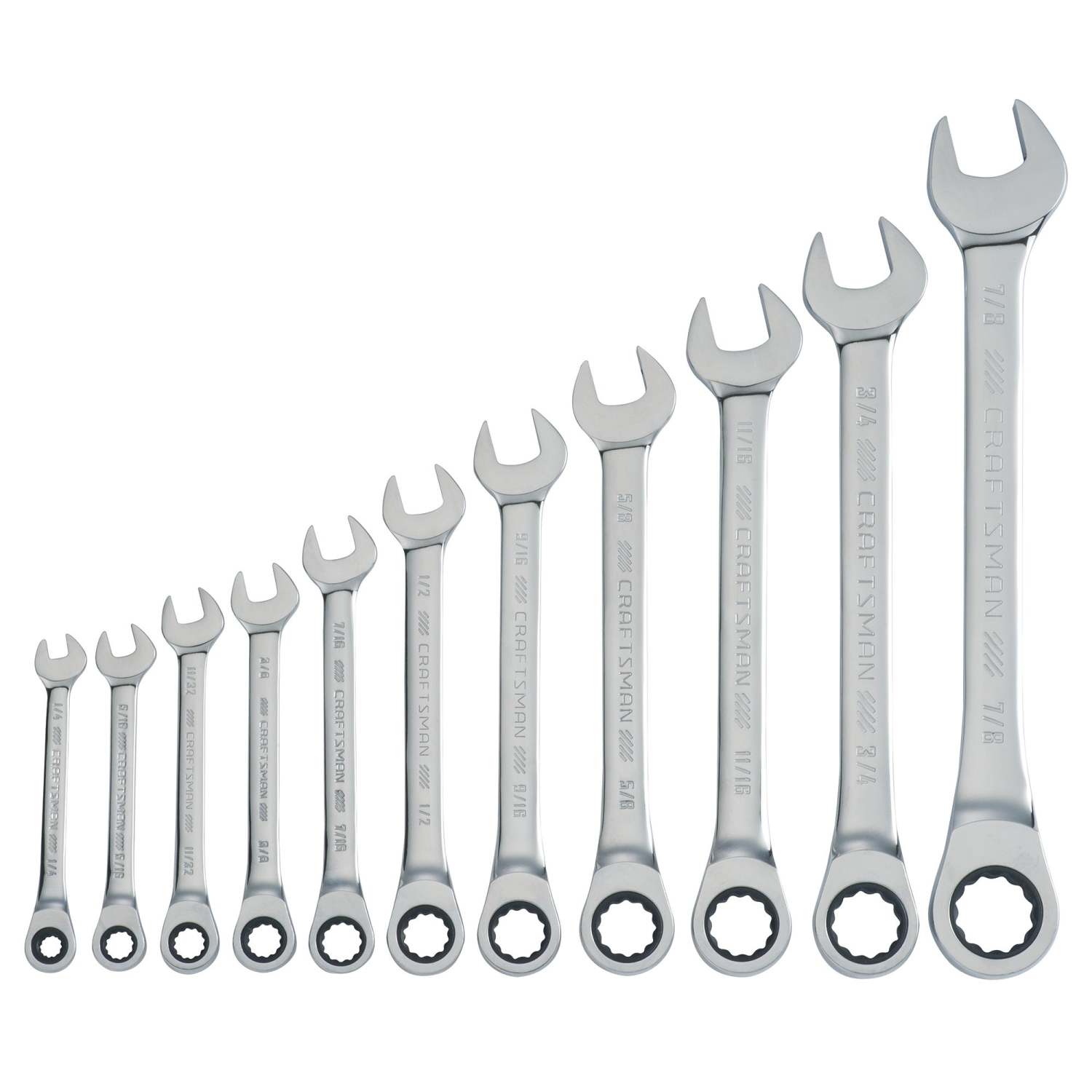 This wrench set is ideal for bolt turning to specific automotive repairs. Full polish chrome finish is corrosion resistant. 12 Point box makes it easy to engage and fasten. 15-Degree box end offset supports additional knuckle clearance. 72 Tooth ratcheting box end helps get to hard-to-reach places. Large markings provide easy size identification. Includes 11 SAE ratcheting wrenches - 1/4" 5/16" 3/8" 7/16" 1/2" 9/16" 5/8" 11/16"< 3/4" 7/8" 15/16".