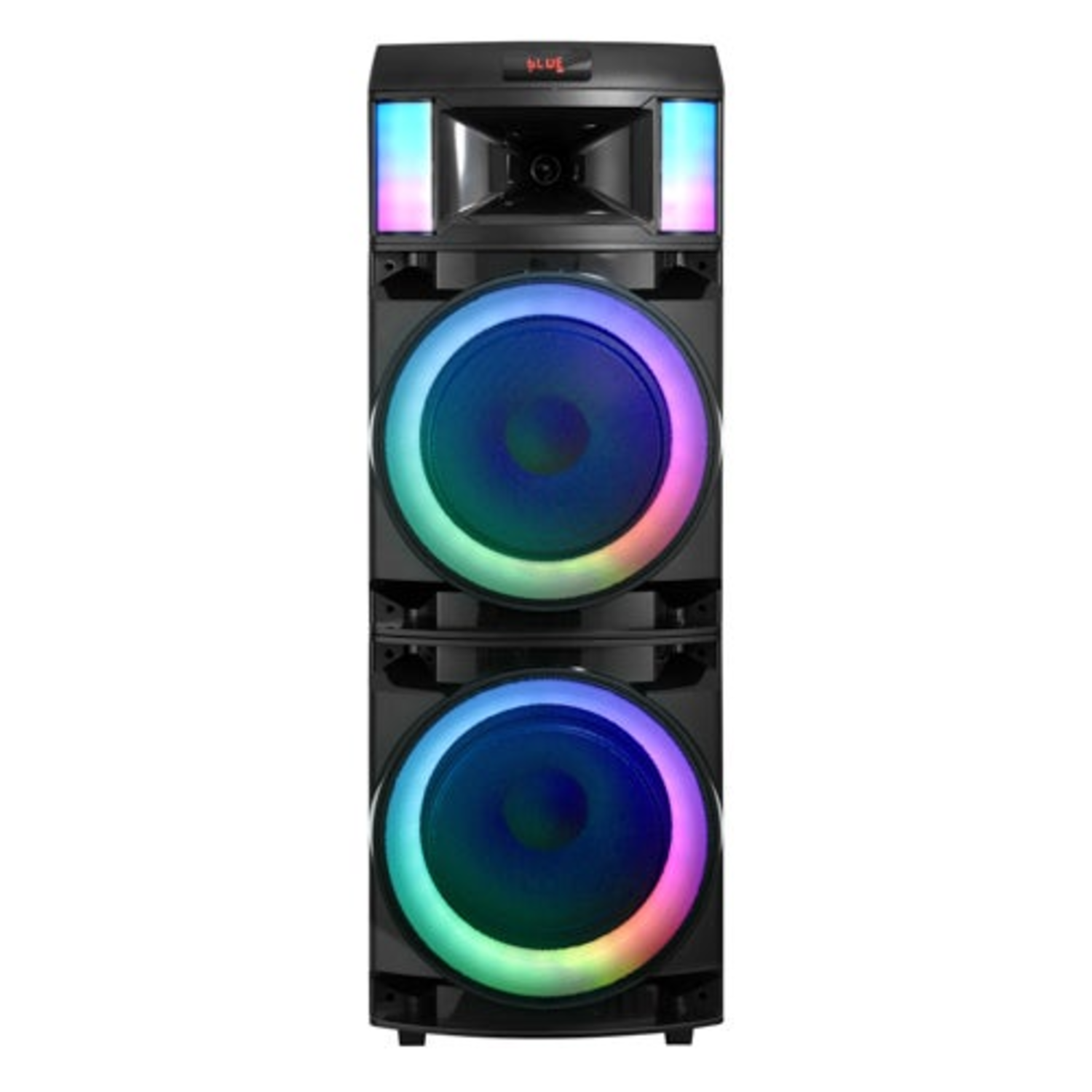 Up to 4 hours of playtime on a single charge. Wirelessly stream audio via Bluetooth. FM Radio- enjoy your favorite stations wherever you go. USB/MicroSD inputs play digital audio files. 2 Mic inputs - connect mics or guitars for more fun. Auxiliary input plays non-Bluetooth devices. LED Rings light up with various modes. Convenient carry handles and 2 wheels. Control panel adjusts EQ mic volume Echo control and bass/treble. 1.5" Tweeter and 2 x 12" Woofers. Power input: 110-240V AC. Includes: Remote control. Wireless mic. Power cord.