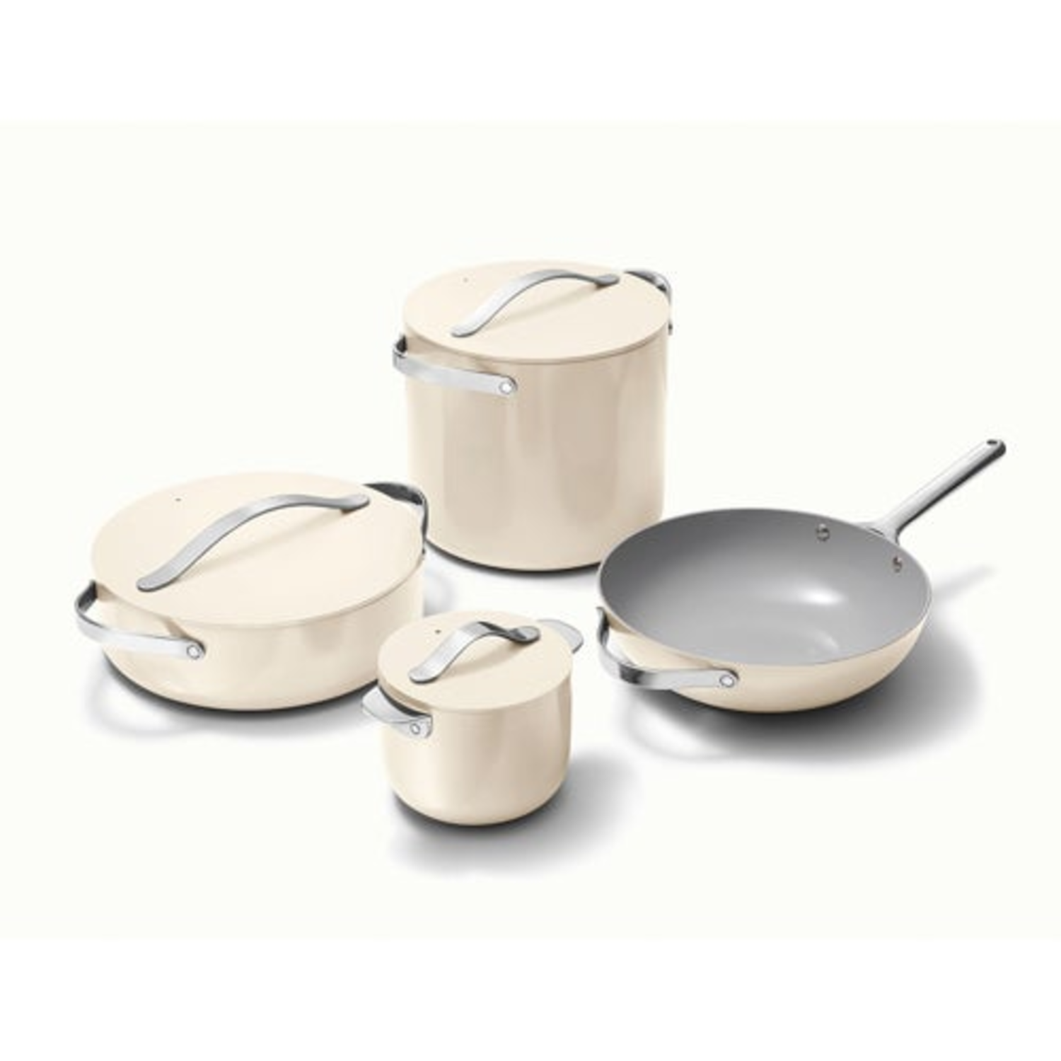 Super slick nonstick requires less oil or butter for cooking. Nonstick ceramic aluminum core and stainless steel handles. Coating is free of PTFE PFOA PFAS heavy metals and hard anodization. Heats evenly avoiding cool spots and unevenly cooked food. Details and color spark joy in your kitchen. Comes with a custom storage solution. Safe on gas electric and induction. Oven safe up to 550F. Recommend hand wash. Includes: 2qt Petite cooker. 6qt Rondeau pan. 12qt Stockpot. 12" Stir fry pan. Storage organizer.