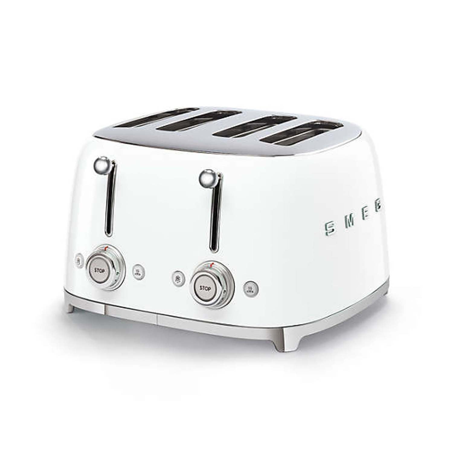 Smeg kitchen appliances offer retro Italian style carried from its founding in 1948. Multi-function control offers versatile toasting options. Features four spacious slots with two independent control panels. Reheat heats toast and bread or continue toasting. Defrost unfreezes frozen slices. Bagel function browns one side of bread without toasting the other. Self-centering racks supports even toasting no matter the size. Offers 6 toasting levels. Backlit buttons and control knobs. 2 Removable crumb tray. Anti-slip feet. Integrated cord.