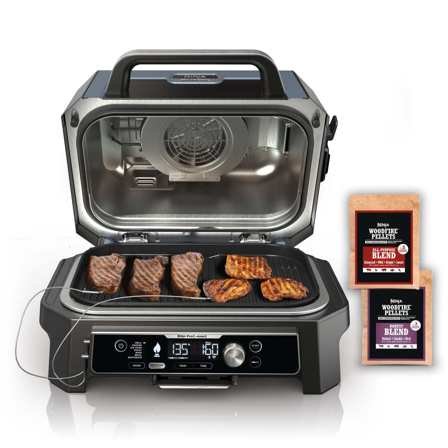 7-in-1 - grill BBQ smoke air fry roast bake broil dehydrate. Woodfire technology - smoke box and convection fan with pellets create rich smoky flavor. ProConnect app - control monitor and receive notifications in realtime from your phone. 180 Square inches of cooking space. 2 Built-in thermometers to cook 2 different protein types. Weather resistant design. Includes: Nonstick grill grate. 2 Built-in thermometers. Crisper basket. Pellet scoop. Grease tray. Disposable grease tray liner. All-Purpose Blend starter pack pellets.