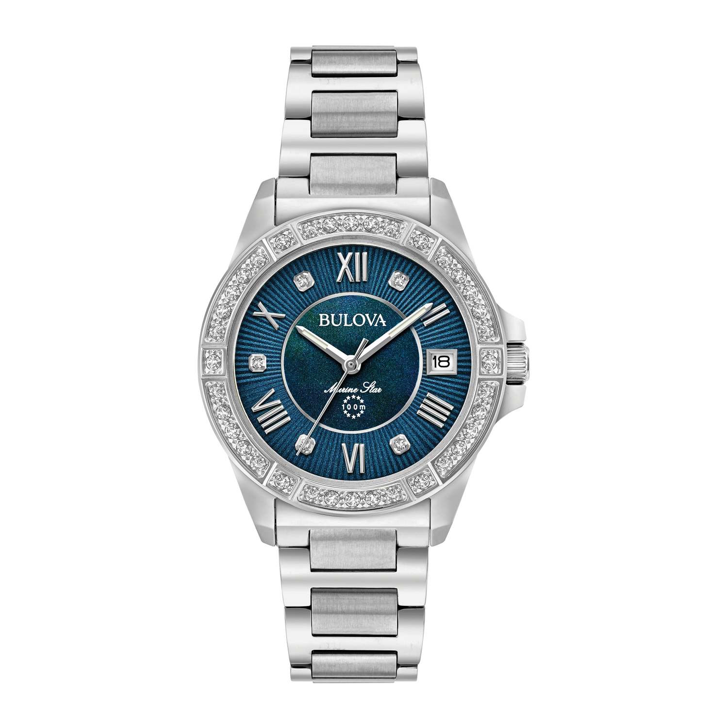 This Marine Star features 29 individually hand set diamonds. Silver-tone stainless steel H-link bracelet bezel and case. Blue Mother-of-Pearl dial with diamond hour markers and Roman numerals. Day of the month window at the 3 position. Three silver-tone hands. Bezel paved with sparkling diamonds. Double push button deployant closure. Sapphire crystal window is scratch resistant. Lug width: 16mm. Case size: 32mm. Water resistant to 100 M.