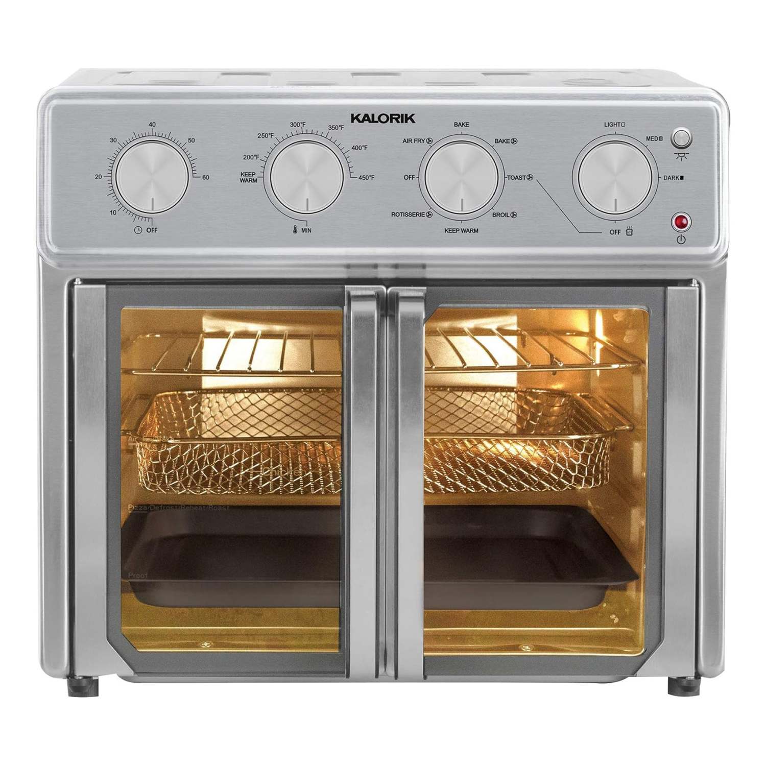 1700W Turbo Maxx technology - accelerated air flow cooks food faster. Functions as an air fryer roaster broiler rotisserie oven toaster pizza oven and more. 26qt Capacity fits a large chicken 12" pizza or 9 slices of toast. Cooks food to crispy golden perfection with reduced oil. Four control dials set temperature time and browning level. Sears up to 450F. Internal dimensions: 11.75"L x 12.75"W x 7.75"H. Includes: Air frying basket. Baking tray. Air rack. Crumb tray. Rotisserie spit and forks. Rack handle. Rotisserie handle.