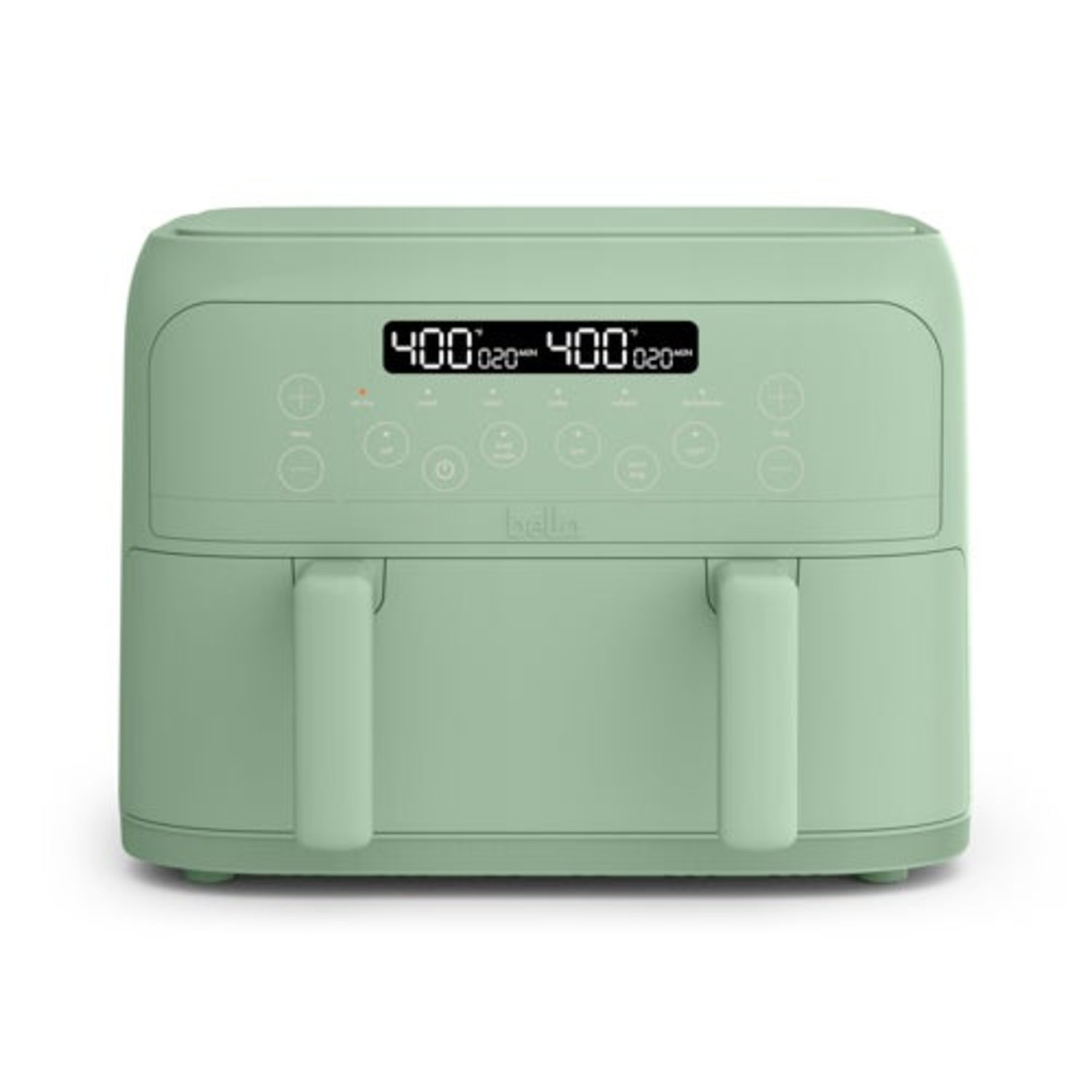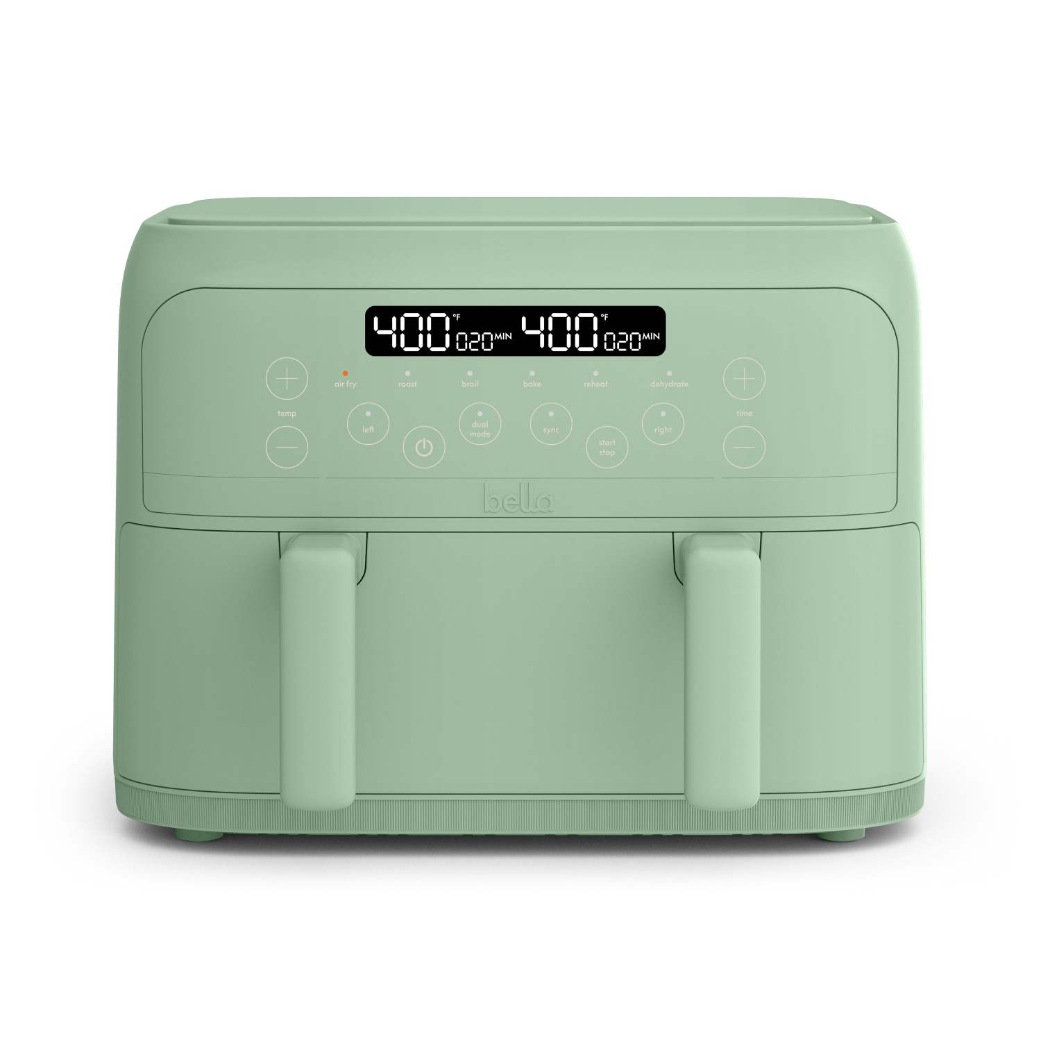 Intuitive digital controls and 6 presets"air fry bake roast broil reheat dehydrate. Removable divider lets you cook two meals or one big meal. Temperature range of 90F to 400Fwith 1200 watts of power and circular heat technology. Basket holds 3lbs of food. Sync Button allows different foods to finish simultaneously. EverGood Ceramic Nonstick Coating is made without PFAS PFOA PTFE lead and cadmium. No more tangled mess"cord neatly tucks away. Cool-touch handles. Touchscreen control panel. Dimensions: 10.91"H x 13.27"W x 9.99"D.