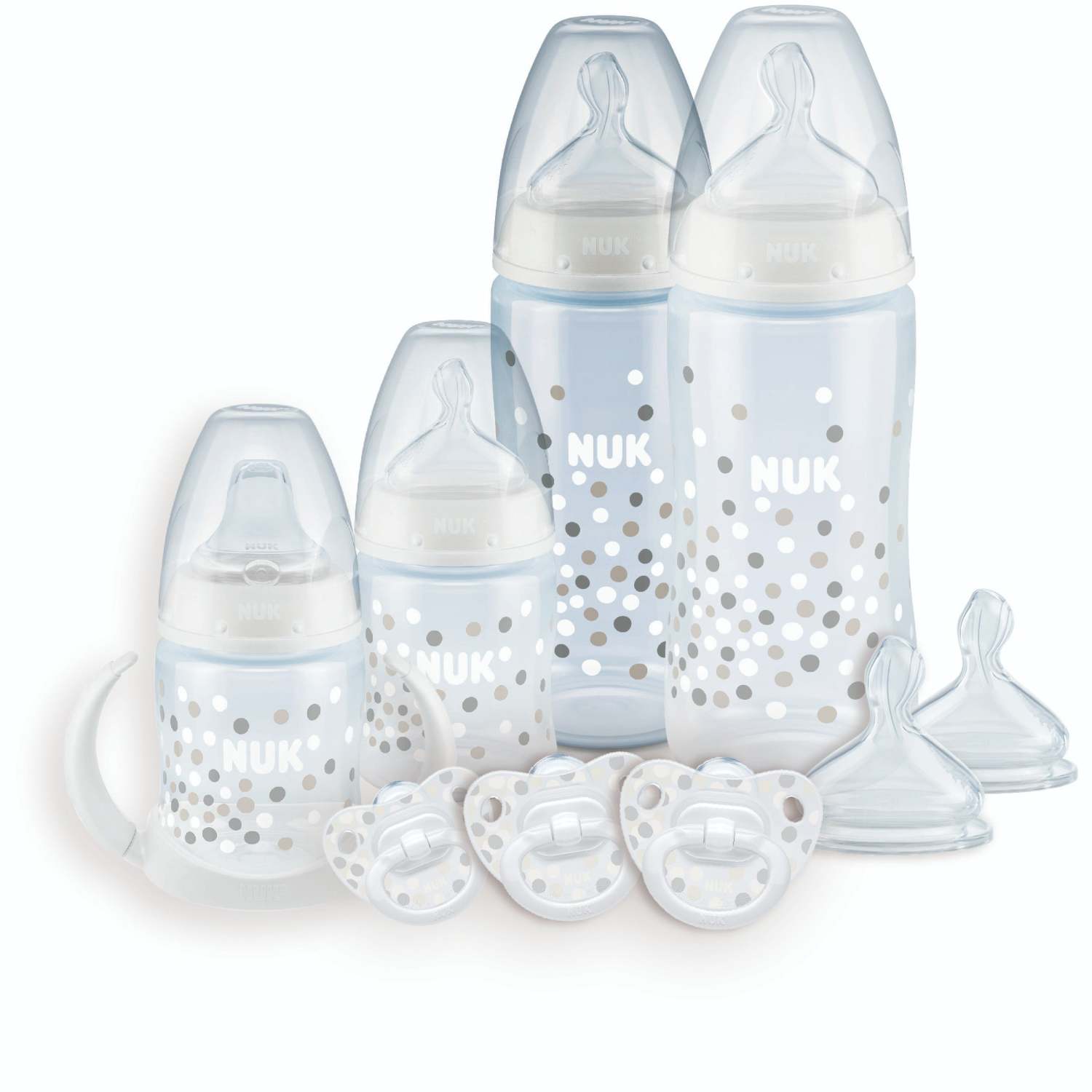 Smooth Flow bottle nipple design lets baby control speed milk flow for colic-free feeding. SafeTemp Indication: thermometer icon on bottle changes color when milk is too hot. Bottle nipple mimics the shape of mom's nursing nipple during breastfeeding. Gives a smooth transition from breast to bottle and back. Parts are BPA-free and top rack dishwasher safe. Includes: (2) 5oz Bottles with slow flow nipples. (2) 10oz Bottles with medium flow nipples. (3) NUK orthodontic pacifiers. Learner cup transition kit. (2) Fast flow nipples.