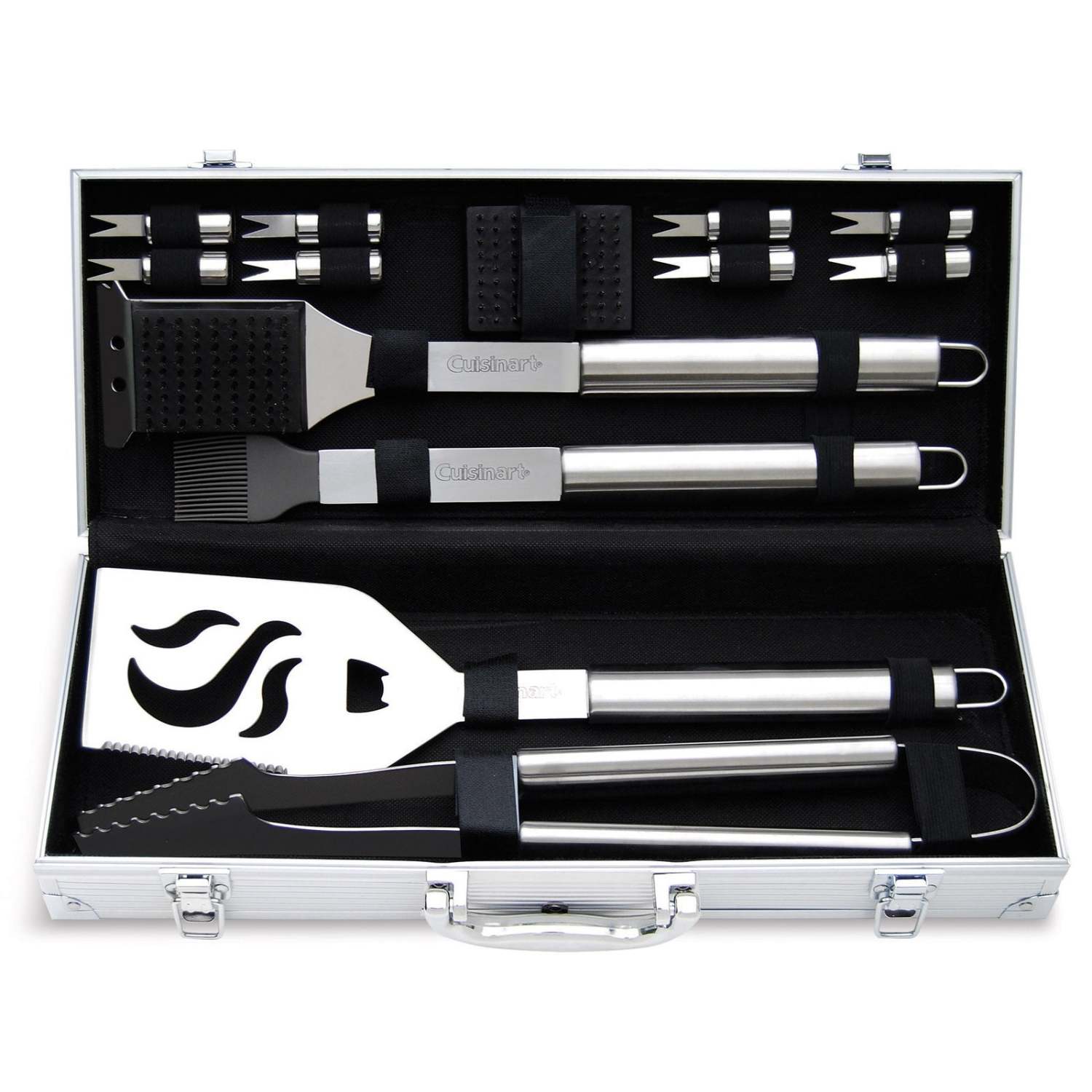 Set Includes Chefs Spatula Grill Tongs Silicone Basting Brush 4 Pairs of Corn Holders Cleaning Brush and Extra Brush Head. Stainless steel tool construction. Set Includes Deluxe Aluminum Storage Case. Elongated handles