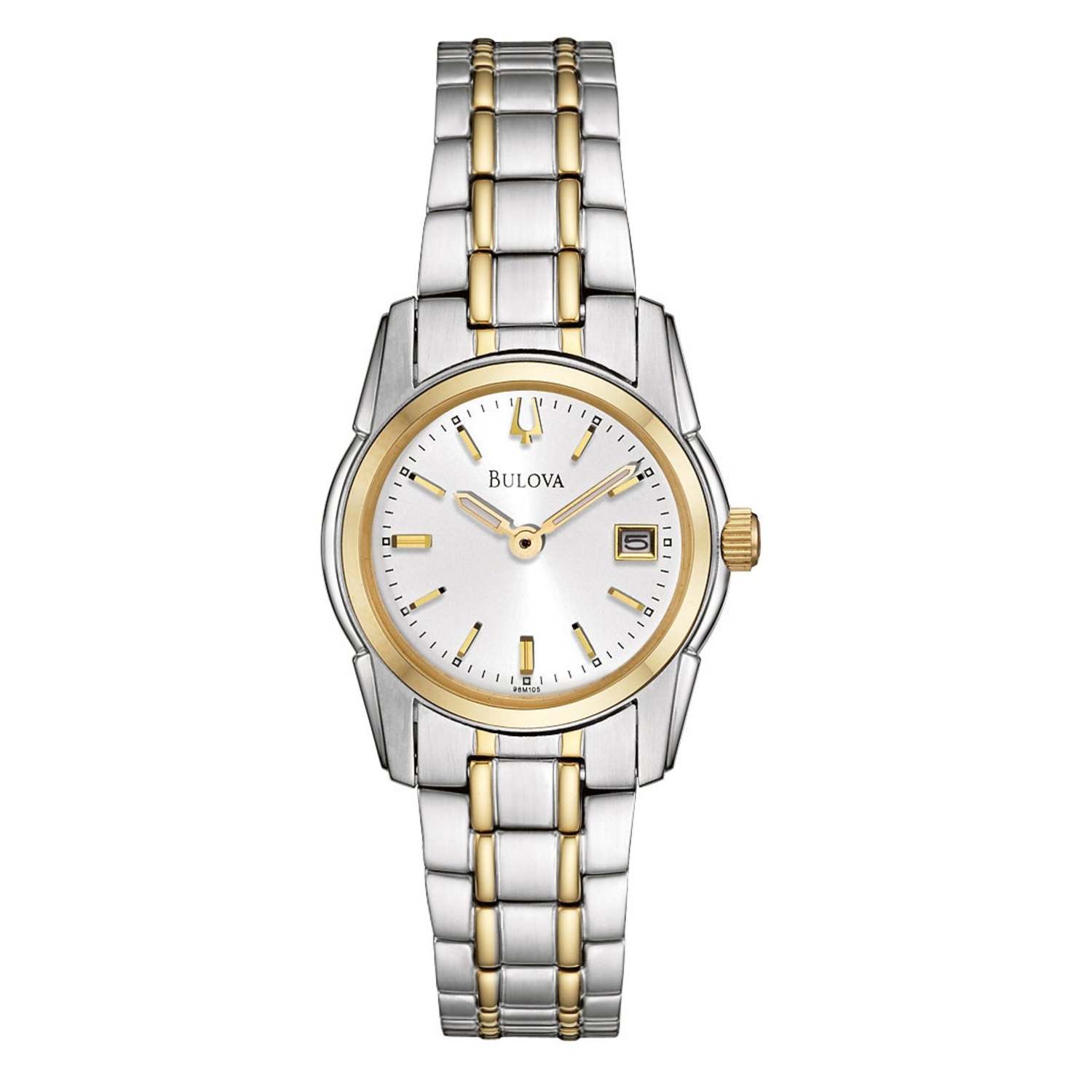 Classic Watches form Bulova offer a blend of timeless design and modern craftsmanship. Silver and gold-tone stainless steel bracelet bezel and case. Silver sunray dial with gold-tone hour indexes. Luminous three hands and markers. Day of the month window at the 3 position. Signature gold-tone tuning fork logo at the 12 position. Minute markers along the outer dial rim. Quartz movement. Double push button fold over closure. Domed mineral crystal is impact and shatter resistant. Lug width: 14mm. Case size: 26mm. Water resistant to 30 M.