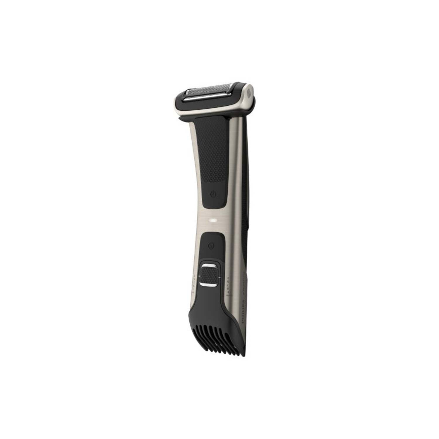 Achieve total body shaving and trimming with the bodygroomer. 4-Directional pivoting head stays close to the contours of your face for a close shave. 5 Adjustable trim lengths from 1/8" (3mm) to 7/16" (11mm). Blades feature rounded tips for smooth skin contact. Showerproof design for convenient use getting ready in the morning. Self-sharpening stainless steel blades. Up to an 80 minute runtime. Ergonomic grip. Low battery indicator. Includes: Body groomer. Trimming guard. Charging cord and adapter.