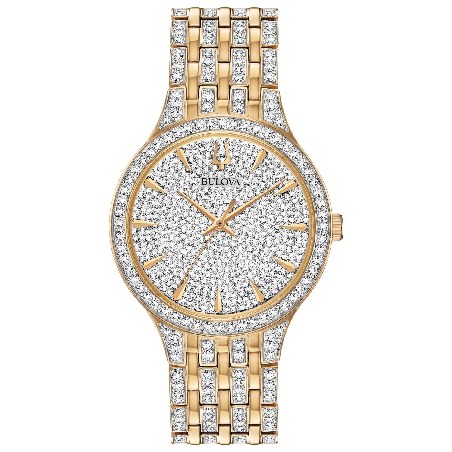 This Phantom watch stands out with an amazing 636 white Swarovski crystals. Gold and Silver-tone stainless steel and Swarovski crystal bracelet. Fully paved Swarovski crystal dial with gold-tone hour markers and three hands. Gold-tone stainless steel bezel is lined with dazzling Swarovski crystals. Butterfly deployant closure. Mineral crystal dial window. Quartz movement. Case thickness: 7.1mm. Case size: 40mm. Water resistant to 30 M.