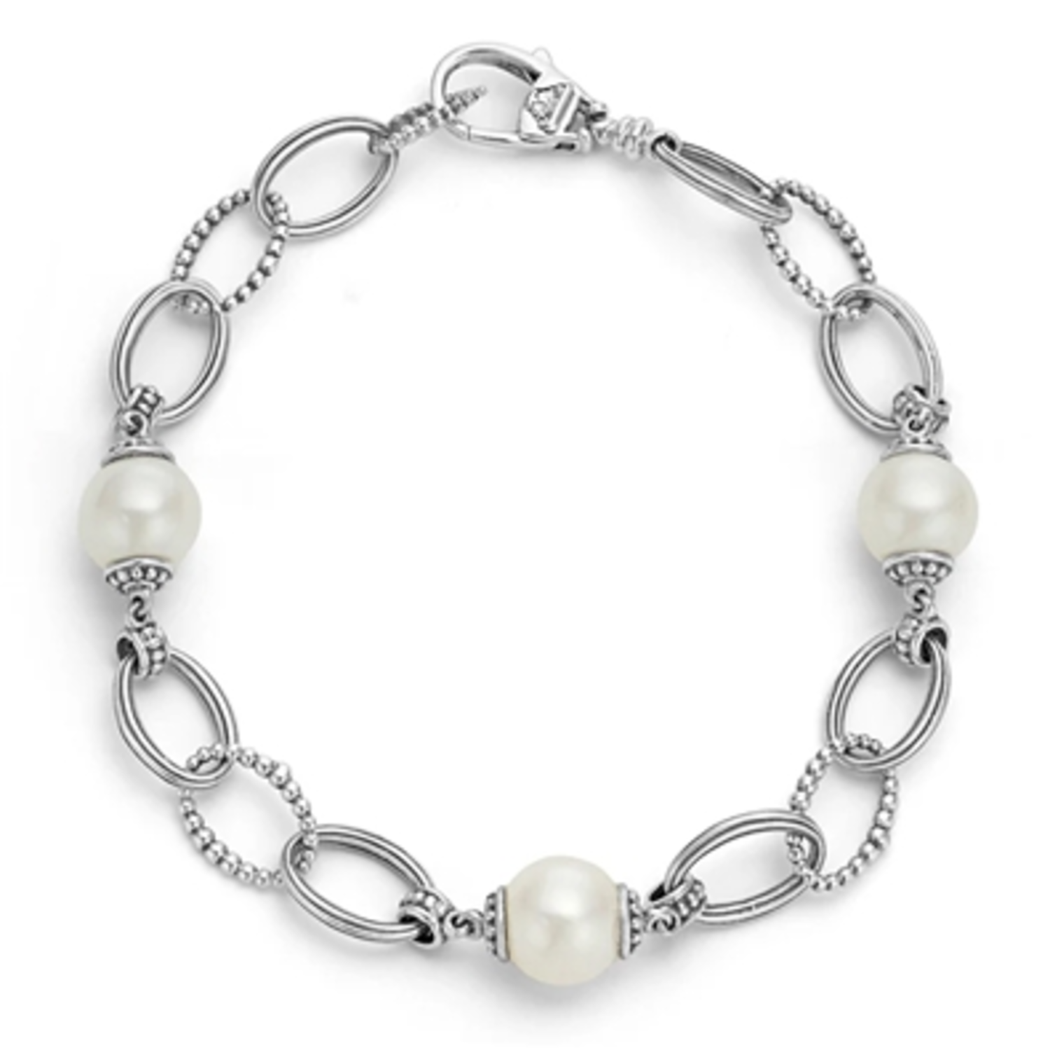 This elegant sterling silver bracelet features three cultured freshwater pearl stations, each adding a touch of natural beauty and sophistication to the design. The pearls are beautifully complemented by Caviar beaded circle link accents, enhancing the bracelet's intricate and refined appearance. Crafted from high-quality sterling silver, this piece is secured with a signature lobster clasp, ensuring both durability and style. With a width of 8mm, the bracelet offers a balanced, timeless look that effortlessly elevates any outfit, making it a must-have accessory for those who appreciate classic elegance.