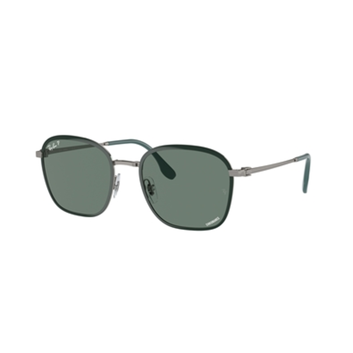 Charged with contemporary charm, this square milled metal style is characterful yet refined. Details include a high-precision hinge and engraved Monoblock temple, with metal caps and colored temple tips. Squared frames crafted from milled metal, featuring a logo-engraved temple cap and colored temple tips. This style comes in a dark green gunmetal frame with grey lenses.