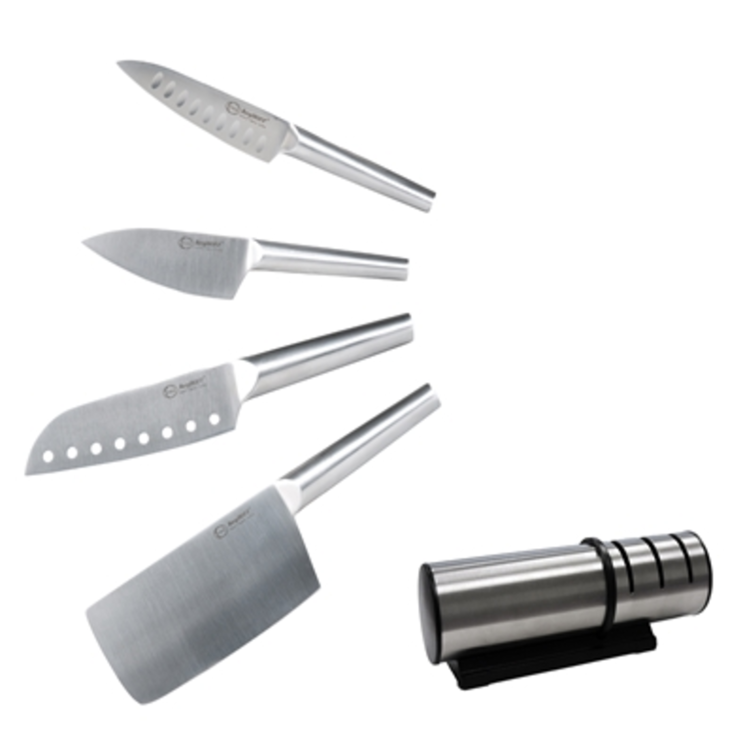 BergHOFF's 5pc Cutlery Set is made of high-quality stainless steel and feature stylish stainless-steel handles. They are easily sharpened and hold their edge well. Ergonomic handles provide you with a comfortable grip. Set includes: (7") Santoku knife with holes, (5”) Santoku knife grooved, (4 1/2") Santoku knife, (7" x 3 1/2") cleaver, and sharpening steel. Always use high-quality steel by BergHOFF for your top-quality knives. These sharpening devices are made to match the steel of the blades and guarantee an optimum result. Be sure to maintain a 20° angle from tip to handle over the complete length of the blade. Handwash recommended with warm water and mild detergent free from bleach or citrus extracts.