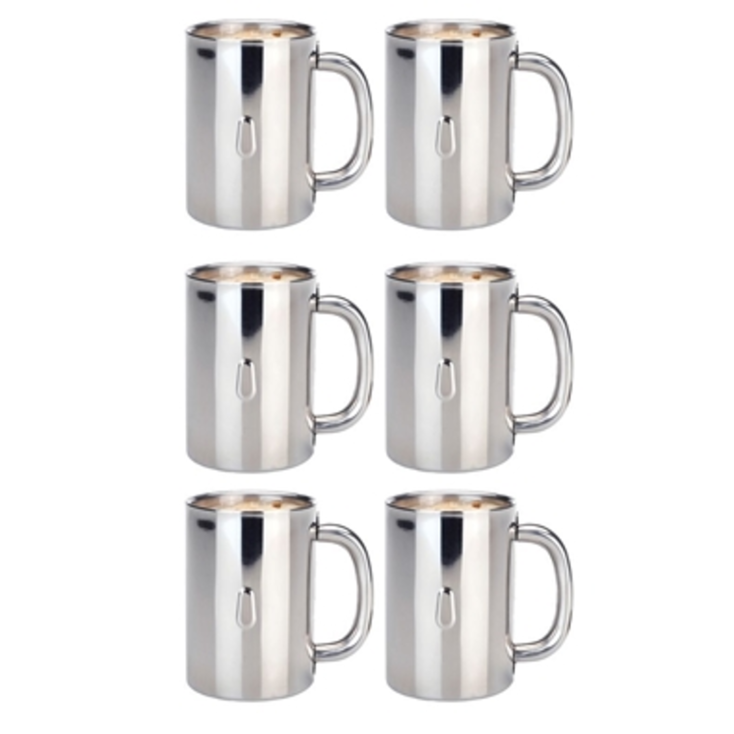 The BergHOFF 18/10 Stainless Steel Mug Set includes six 12oz coffee mugs designed for durability and long-lasting use. Featuring double-wall construction, these mugs keep your beverages hot or cold for longer, ensuring the perfect temperature every time. Made from shatterproof and corrosion-resistant stainless steel, they are ideal for both indoor and outdoor use. This set is perfect for groups and is easy to clean as it is dishwasher safe. Whether at home or on the go, these mugs enhance your drinking experience.