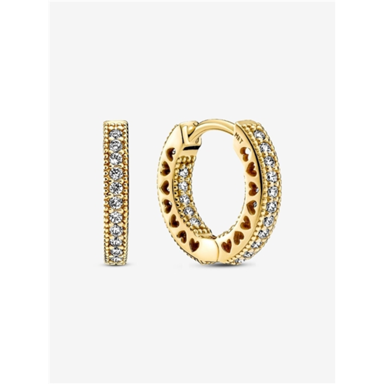 Frame your face with these warm-toned Pavé Heart Hoop Earrings. These 14k gold-plated hoops are hand-finished and embellished with sparkling clear cubic zirconia pavé and micro-beading inside and outside thehoop, along with cut-out hearts on the sides. Geometric, sophisticated and versatile, these hoops will be just as stylish when worn with a simple daytime look or dressed up for a special occasion.