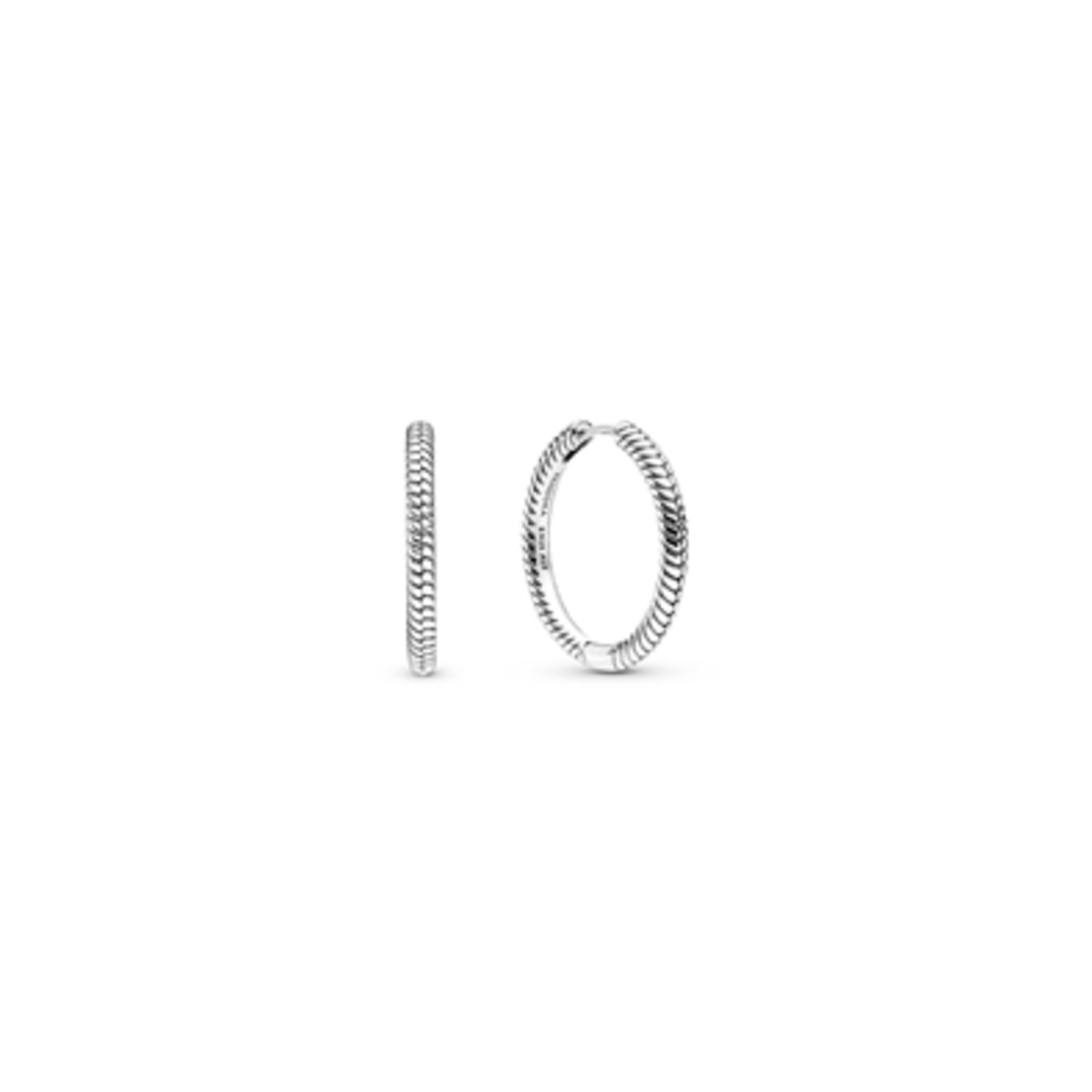 Create an instantly iconic look with the Pandora Moments Charm Hoop Earrings. These sterling silver earrings feature Pandora's famous snake chain pattern. Each hoop is the same size as a small Pandora O Pendant, meaning they can hold up to three charms, dangles or pendants (just be careful not to overload them, so they don't weigh down your ears). Sleek on their own or personalized when paired with your favorite charms, these hoops are a style win