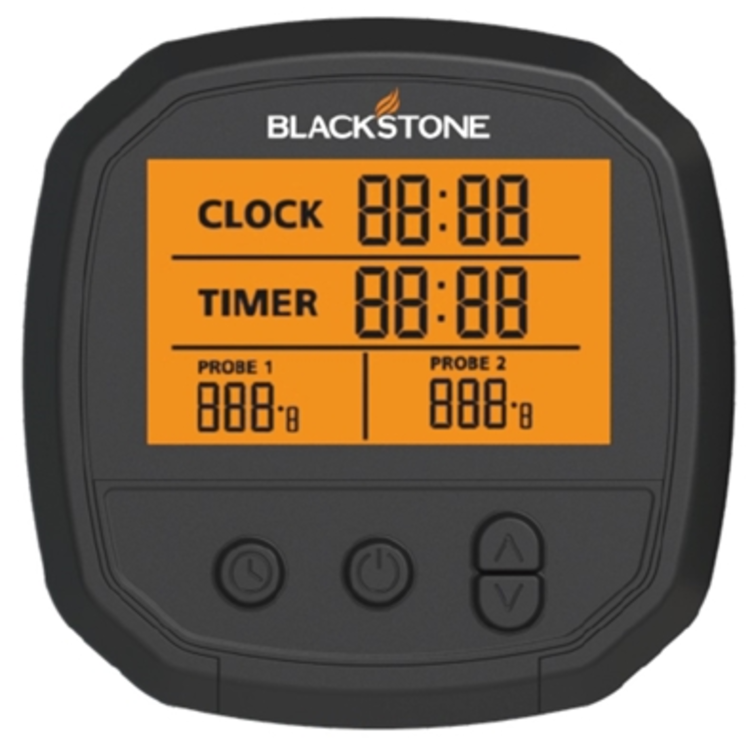 Ensure that your meals are cooked to perfection with Blackstone's Two Probe Combo Thermometer. The thermometer display easily attaches to your griddle using the new Side Shelf Rail System, the pivoting screen can tilt up to make it easy to read. Equipped with a clock, countdown timer, and two probes, you'll be cooking steaks and burgers to your preferred doneness. The Thermometer display is rechargeable and waterproof, making it the perfect accessory for all gridlers.