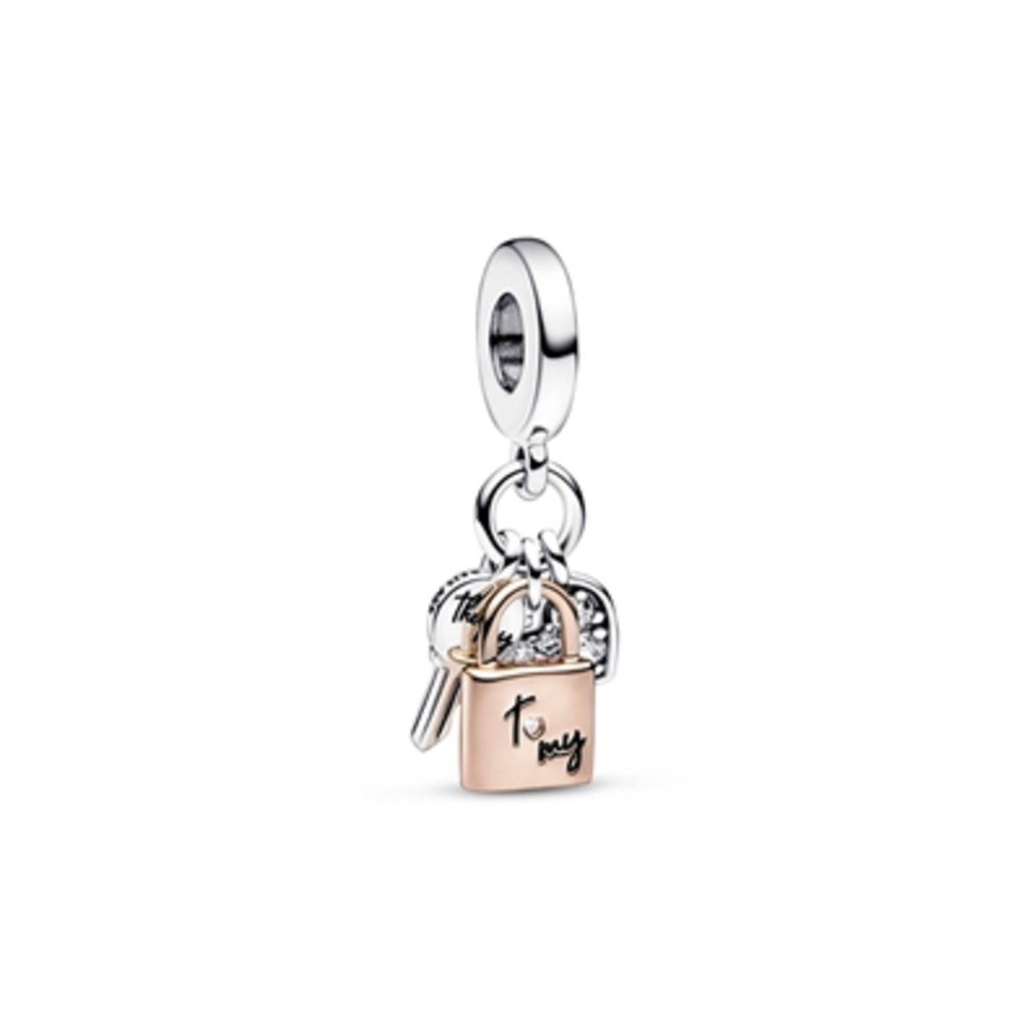 Lock in your love with our Two-tone Key, Padlock and Heart Triple Dangle Charm. The sterling silver key is engraved with the words "The key" and the 14k rose gold-plated padlock features the engraving "To my", referencing the sterling silver heart charm embellished with pavé. Adding extra sparkle, a clear cubic zirconia is shaped to fit the padlock's keyhole. Give it to the one who holds the key to your heart - whether that's yourself or someone else.