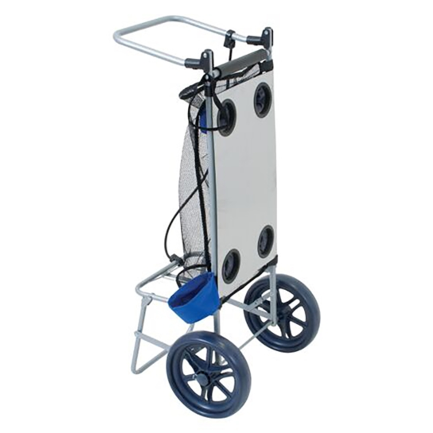 Take everything you need with you to the beach with the Wonder Cart Beach Cart. The Wonder Cart Beach Cart carries up to 4 standard sized beach chairs and features an aluminum clad table top with 4 cup holders. It is perfect for lunch on the beach. Comes with a mesh storage pouch, umbrella holder, and bungee cord for easy transport for all of your beach needs. Rolls easily thanks to its sturdy 10 inch rubber tread wheels. Aluminum clad table top with 4 cup holder Umbrella holder Mesh storage pouch Bungee cord Carries up to 4 chairs Open dimensions 40 x 18 x 14 inches Tabletop dimensions 22 x 13.5 inches