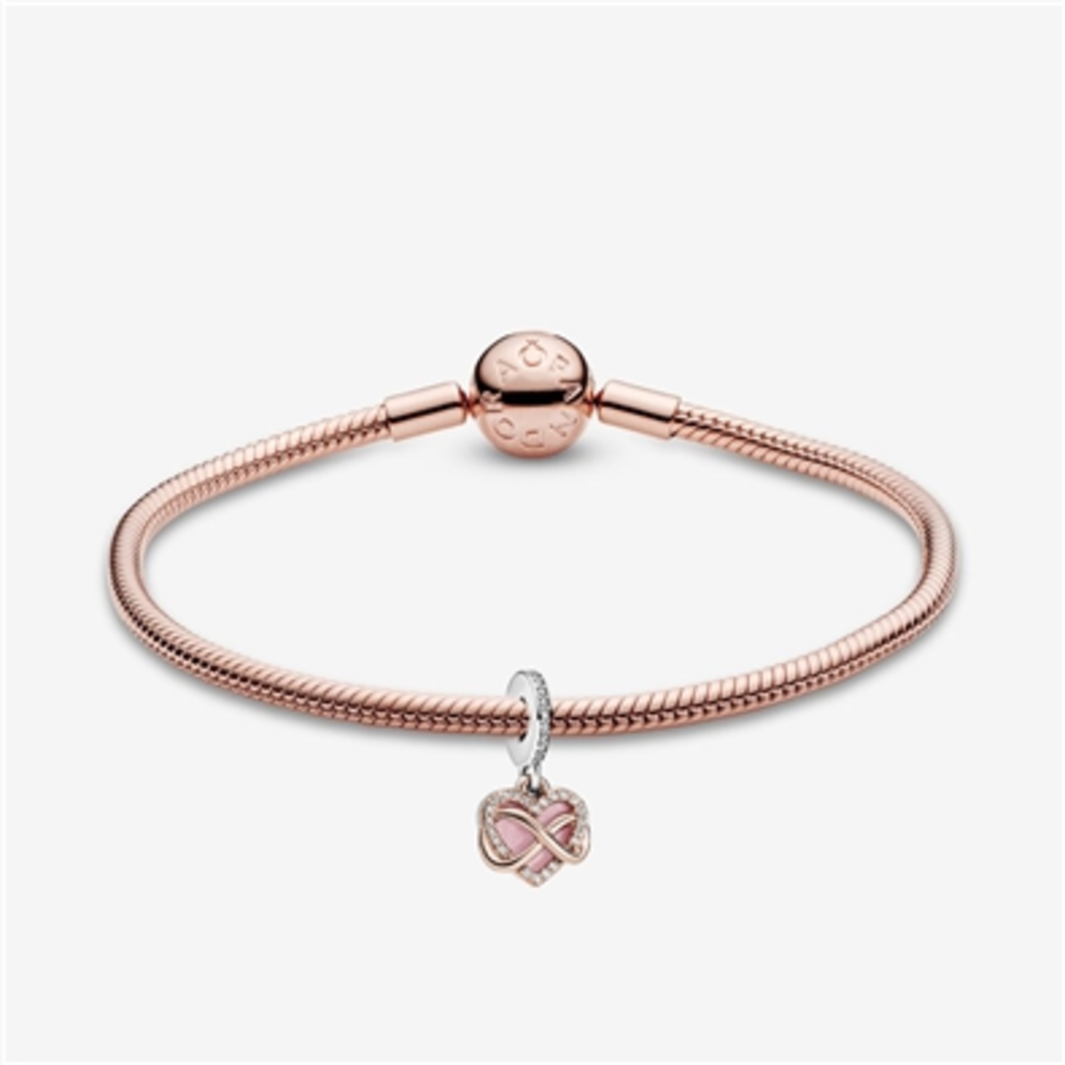 Pandora presents the beautiful Rose Gold Sparkling Infinity Heart Bracelet featuring 1 Sparkling Infinity Heart dangle charm on the Rose Moments Snake Chain Bracelet.