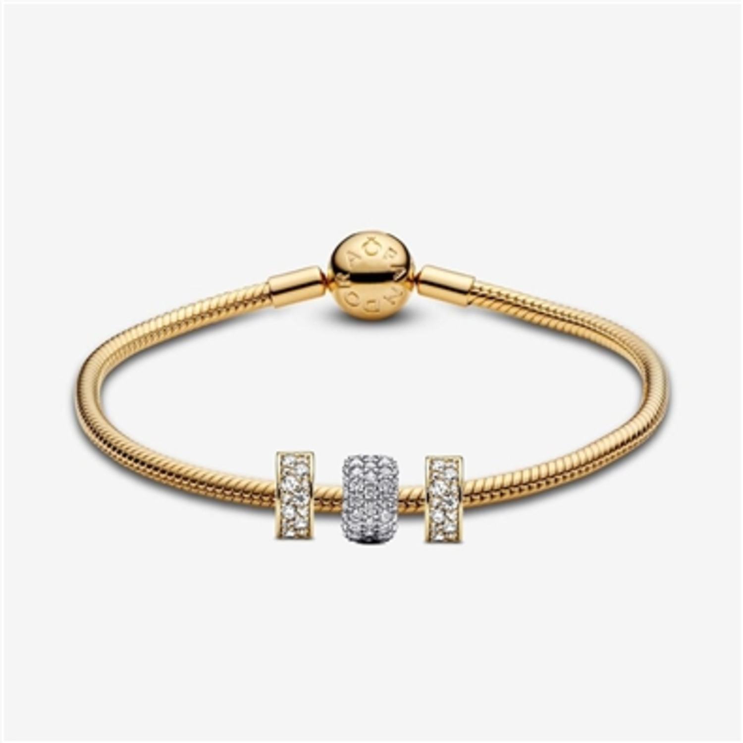 For the Pandora lover in your life who shines wherever they go. The gold plated bracelet makes a beautiful base for a Pandora bracelet, adding a modern twist to the Pandora bracelet we all know and love. In the center, the sparkling pavé triple-row charm delivers a touch of sparkle to any ensemble. On each side, the gold plated clip charms tie the bracelet together and keep your centerpiece securely on your bracelet. This bracelet is a beautiful gift for those who always go for gold (a gift for yourself still counts!)