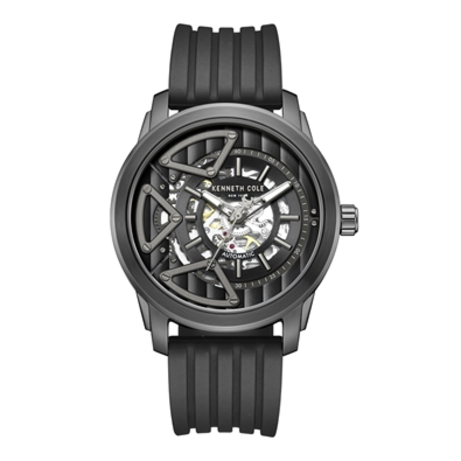 Stylish, reliable, and versatile, the Kenneth Cole New York automatic watch redefines modern watchmaking. The 3-hand automatic movement is enhanced with a striking gold-tone balance wheel and contrast details that highlight the intricacy of the inner mechanics. The black top ring, along with gun-metal hands and line hour markers, gives this timepiece a contemporary edge, while the black dial's unique geometric elements and screw details add a touch of modern sophistication. Designed for versatility, the flexible black silicone strap complements the watch's sleek aesthetic, ensuring comfort and style.