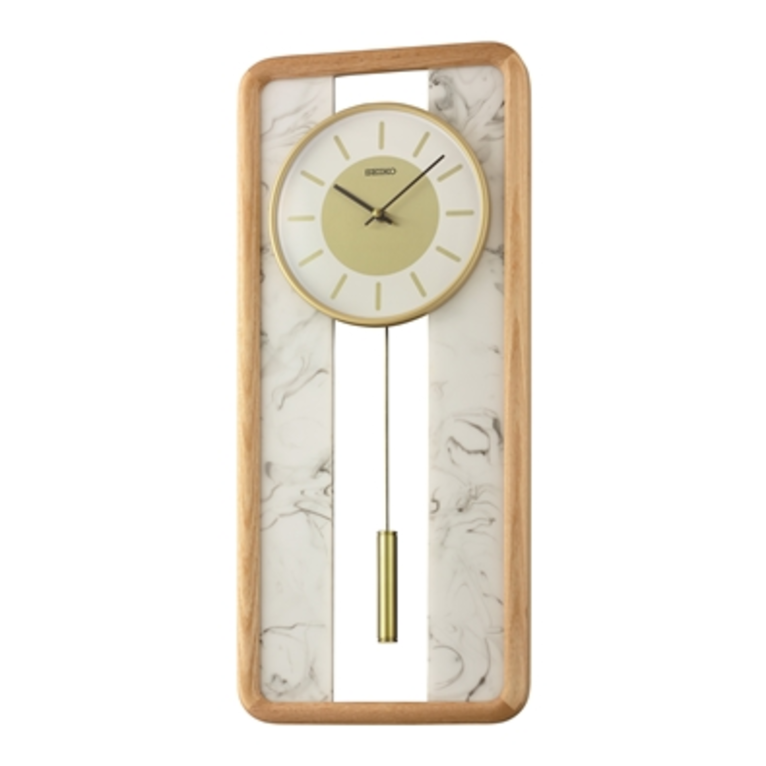 Seiko Bianco Pendulum Wall Clock – A Modern Classic with a Marbleous Twist! Elevate your wall game with the Seiko Bianco Pendulum Wall Clock—where modern design meets graceful movement. Featuring sleek numeral indicators, a sophisticated faux marble pattern, and a refined aluminum dial, this clock adds a pop of personality with a dash of elegance. The wooden case houses a smooth-swinging pendulum for that extra dose of visual delight, all powered by a whisper-quiet quartz crystal movement for ultra-accurate timekeeping—no ticking, just style. One AA battery (included!) keeps it all running effortlessly. With overall dimensions of 24" x 10.5" x 2.4", the Bianco makes a bold yet tasteful statement in bedrooms, living rooms, or study spaces—from tween to adult. Sleek. Chic. Swinging in style. The Bianco is more than a clock—it's a vibe.