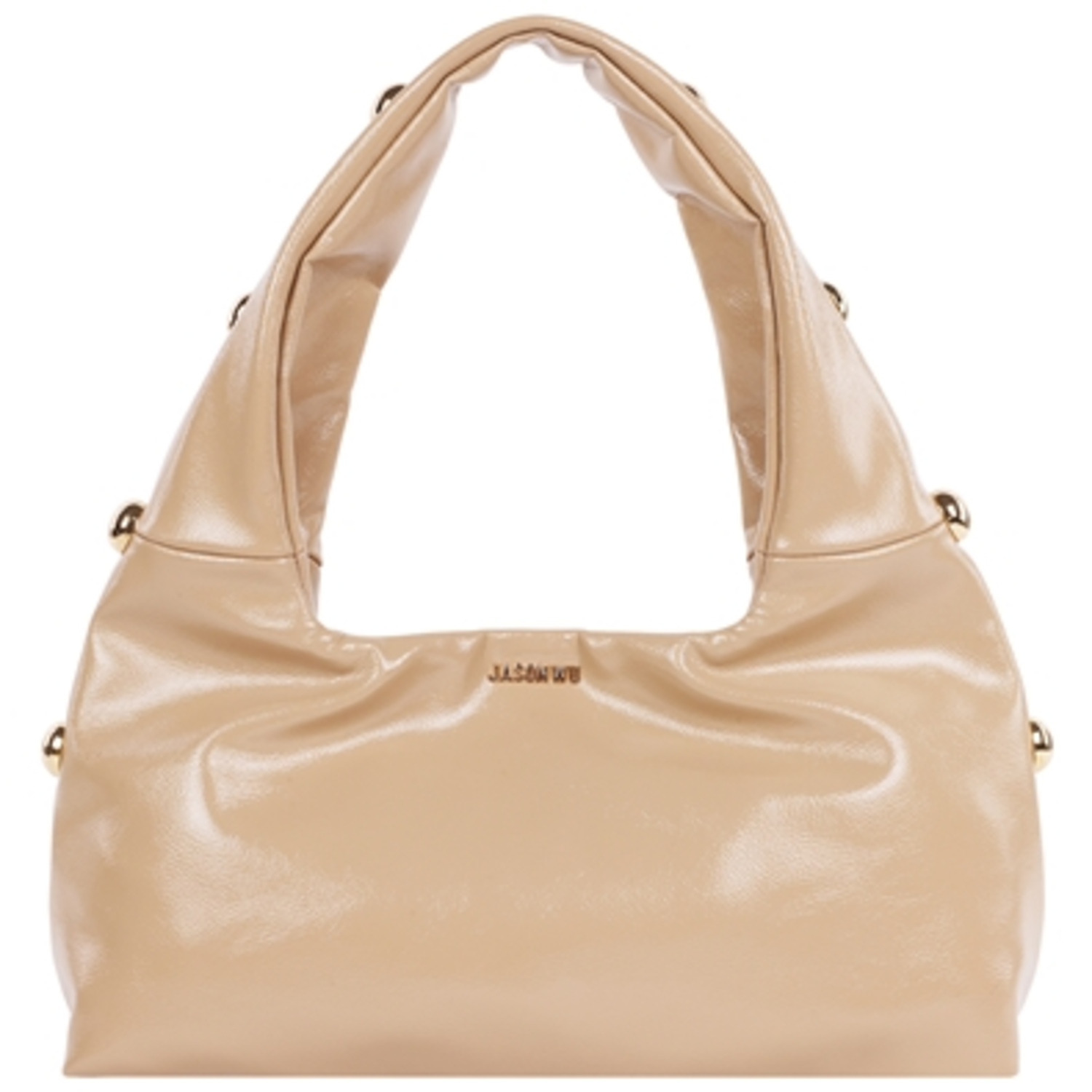 Turn heads with the Jason Wu Studded Shoulder Bag, a bold blend of modern luxury and edgy refinement. Crafted in a high-shine crackled PU finish, this sleek silhouette is elevated with gleaming gold-tone stud accents that trace its sculpted shoulder strap for an artful, statement-making touch. Designed with a secure magnetic snap closure, gold hardware, and a well-appointed interior featuring a backwall zip pocket, it offers both style and function. Subtle Jason Wu logo hardware adds a signature finish, making this carryall perfect for fans of the brand's bold minimalism. Officially licensed and imported, the bag is made from 100% polyurethane, measuring 7.5"H x 13"W x 3.5"D, weighing just 1 lb.—an effortlessly chic piece that transitions seamlessly from day to night with contemporary flair.