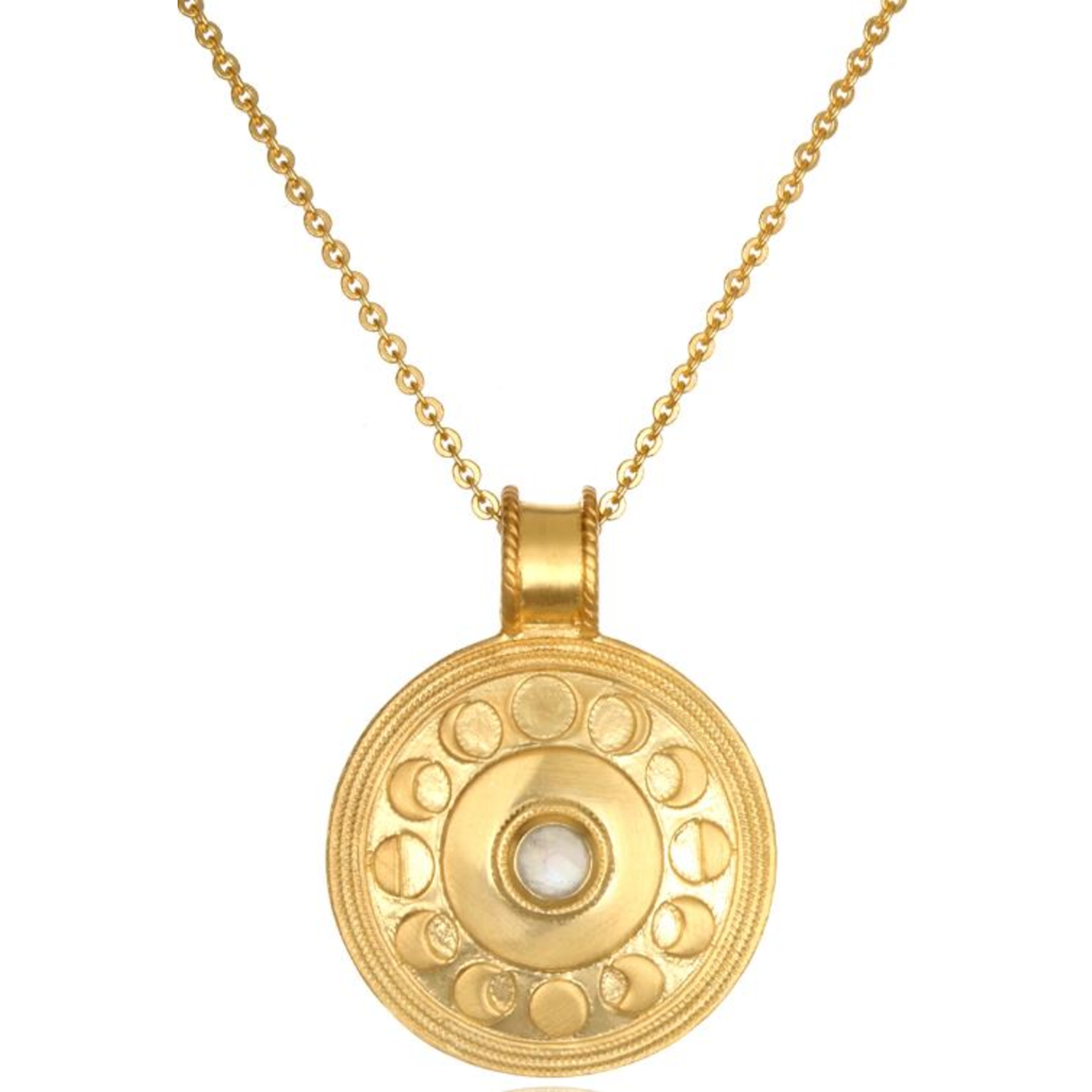 Guided by the phases of the moon, we revel in our divine feminine power. A luminous moonstone - beloved for enhancing passion, intuition and good fortune - is surrounded by hand-engraved phases of the moon for an 18k gold plate coin pendant necklace to ignite your goddess energy.